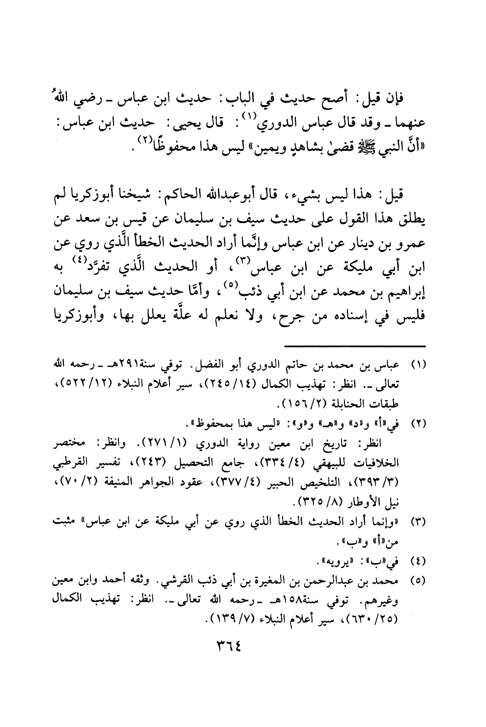قيل: هذا ليس بشيء، قال أبو عبد الله الحاكم: شيخنا أبو زكريا لم يطلق هذا القول على حديث سيف بن سليمان عن قيس بن سعد عن عمرو بن دينار عن ابن عباس وإنَّما أراد الحديث الخطأ الَّذي روي عن ابن أبي مليكة عن ابن عباس (¬3)، أو الحديث الَّذي تفرَّد (¬4) به إبراهيم بن محمد عن ابن أبي ذئب (¬5)، وأمَّا حديث سيف بن سليمان فليس في إسناده من جرح، ولا نعلم له علَّة يعلل بها، وأبو زكريا