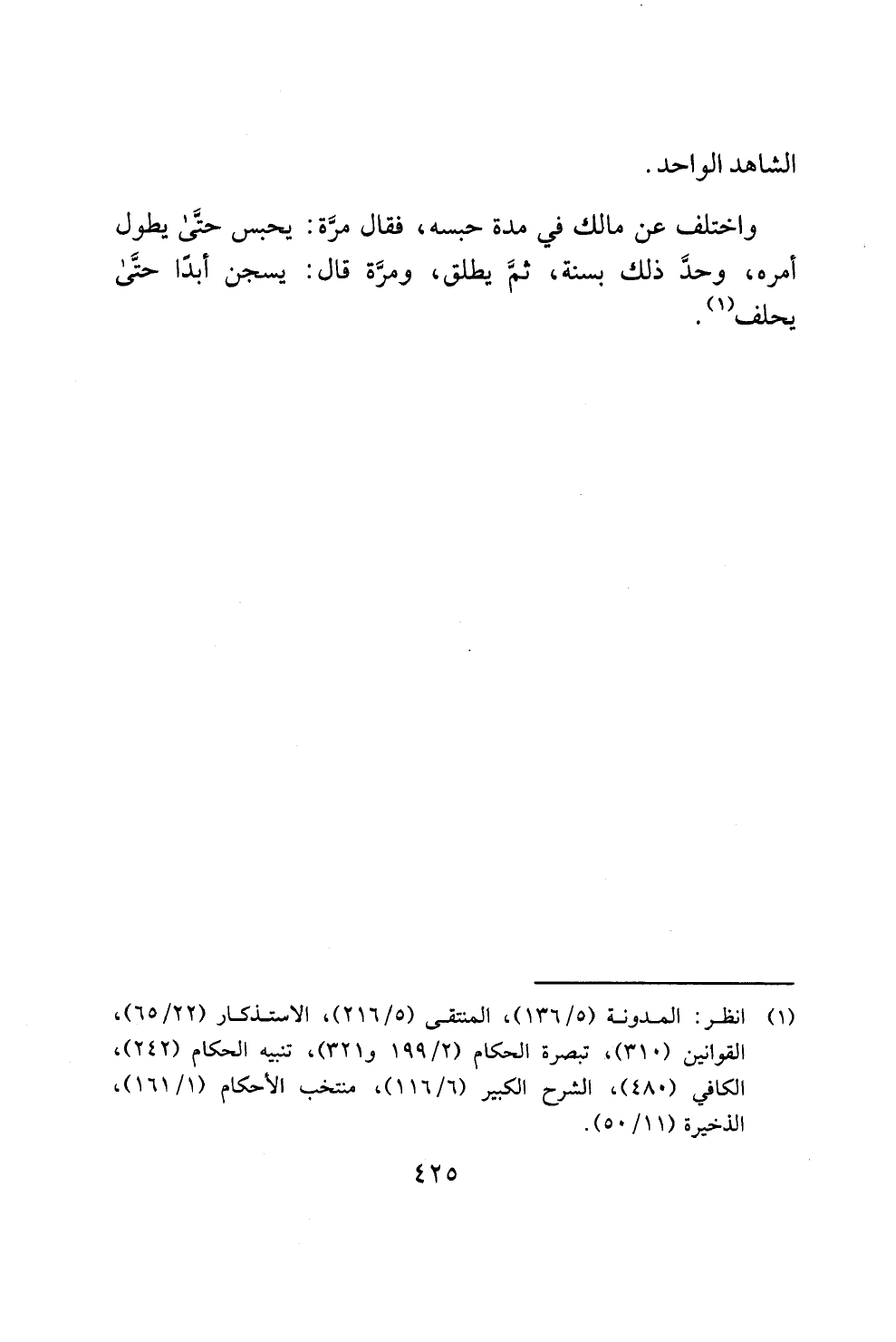 (¬1) انظر: المدونة (5/ 136)، المنتقى (5/ 216)، الاستذكار (22/ 65)، القوانين (310)، تبصرة الحكام (2/ 199 و 321)، تنبيه الحكام (242)، الكافي (480)، الشرح الكبير (16/ 116)، منتخب الأحكام (1/ 161)، الذخيرة (11/ 50).