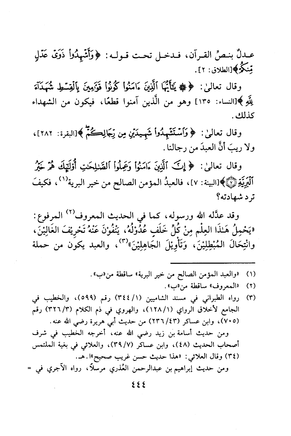 وقد عدَّله الله ورسوله، كما في الحديث المعروف (¬2) المرفوع: "يَحْمِلُ هَذَا العِلْم مِنْ كُلِّ خَلَفٍ عُدُوْلُهُ، يَنْفُوْنَ عَنْهُ تَحْرِيْفَ الغَالِيْنَ، وانْتِحَالَ المُبْطِلِيْنَ، وَتَأْوِيْلَ الجَاهِلِيْنَ" (¬3)، والعبد يكون من حملة
