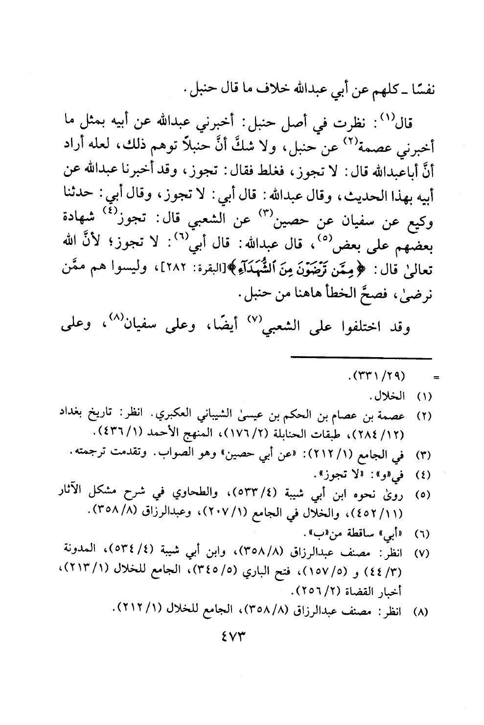 قال (¬1): نظرت في أصل حنبل: أخبرني عبد الله عن أبيه بمثل ما أخبرني عصمة (¬2) عن حنبل، ولا شكَّ أنَّ حنبلًا توهم ذلك، لعله أراد أنَّ أبا عبد الله قال: لا تجوز، فغلط فقال: تجوز، وقد أخبرنا عبد الله عن أبيه بهذا الحديث، وقال عبد الله: قال أبي: لا تجوز، وقال أبي: حدثنا وكيع عن سفيان عن حصين (¬3) عن الشعبي قال: تجوز (¬4) شهادة بعضهم على بعض (¬5)، قال عبد الله: قال أبي (¬6): لا تجوز؛ لأنَّ الله تعالى قال: {مِمَّنْ تَرْضَوْنَ مِنَ الشُّهَدَاءِ} [البقرة: 282]، وليسوا هم ممَّن نرضى، فصحَّ الخطأ ها هنا من حنبل.