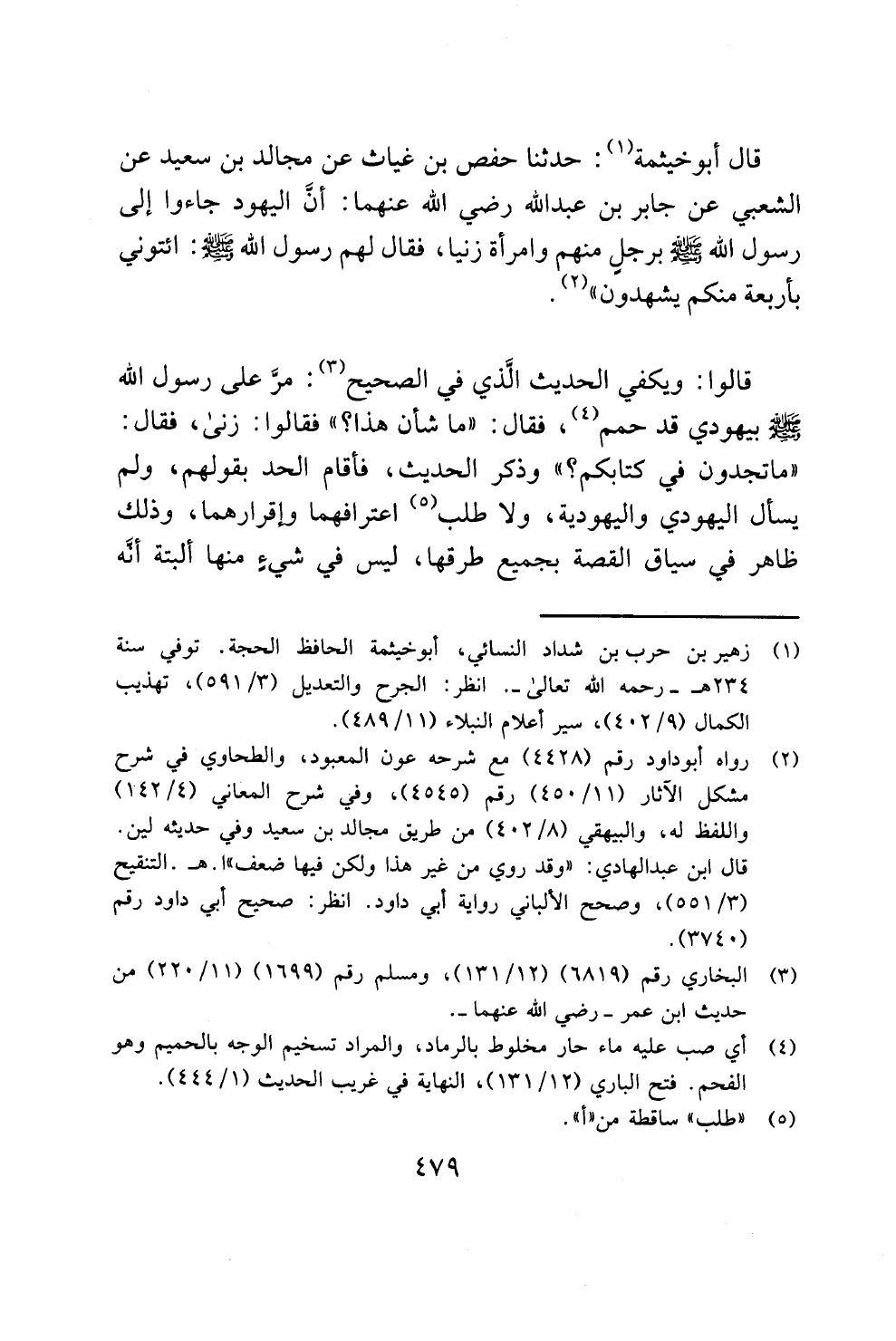 قال أبو خيثمة (¬1): حدثنا حفص بن غياث عن مجالد بن سعيد عن الشعبي عن جابر بن عبد الله رضي الله عنهما: أنَّ اليهود جاءوا إلى رسول الله - صلى الله عليه وسلم - برجلٍ منهم وامرأة زنيا، فقال لهم رسول الله - صلى الله عليه وسلم -: ائتوني بأربعة منكم يشهدون" (¬2).