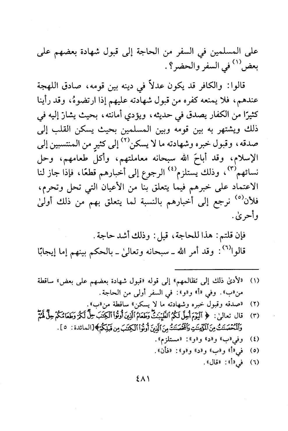 قالوا: والكافر قد يكون عدلًا في دينه بين قومه، صادق اللهجة عندهم، فلا يمنعه كفره من قبول شهادته عليهم إذا ارتضوهُ، وقد رأينا كثيرًا من الكفار يصدق في حديثه، ويؤدي أمانته، بحيث يشار إليه في ذلك ويشتهر به بين قومه وبين المسلمين بحيث يسكن القلب إلى صدقه، وقبول خبره وشهادته ما لا يسكن (¬2) إلى كثيرٍ من المنتسبين إلى الإسلام، وقد أباحَ الله سبحانه معاملتهم، وأكل طعامهم، وحل نسائهم (¬3)، وذلك يستلزم (¬4) الرجوع إلى أخبارهم قطعًا، فإذا جاز لنا الاعتماد على خبرهم فيما يتعلق بنا من الأعيان التي تحل وتحرم، فلأن (¬5) نرجع إلى أخبارهم بالنسبة لما يتعلق بهم من ذلك أولى وأحرى.