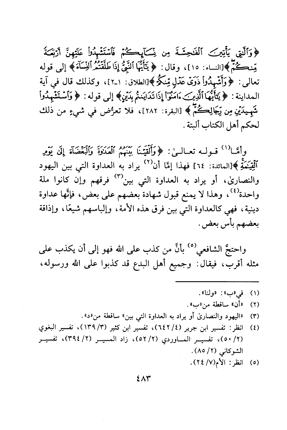 {وَاللَّاتِي يَأْتِينَ الْفَاحِشَةَ مِنْ نِسَائِكُمْ فَاسْتَشْهِدُوا عَلَيْهِنَّ أَرْبَعَةً مِنْكُمْ} [النساء: 15]، وقال: {يَاأَيُّهَا النَّبِيُّ إِذَا طَلَّقْتُمُ النِّسَاءَ} إلى قوله تعالى: {وَأَشْهِدُوا ذَوَيْ عَدْلٍ مِنْكُمْ} [الطلاق: 1 - 2]، وكذلك قال في آية المداينة: {يَاأَيُّهَا الَّذِينَ آمَنُوا إِذَا تَدَايَنْتُمْ بِدَيْنٍ} إلى قوله: {وَاسْتَشْهِدُوا شَهِيدَيْنِ مِنْ رِجَالِكُمْ} [البقرة: 282]، فلا تعرُّض في شيءٍ من ذلك لحكم أهل الكتاب ألبتة.
