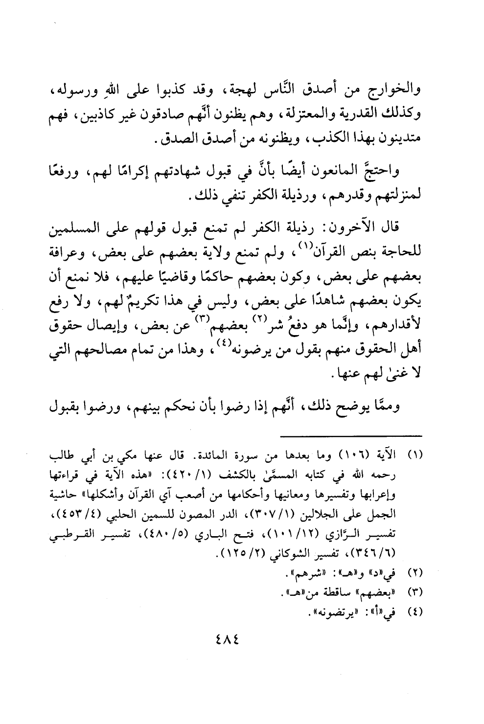 (¬1) الآية (106) وما بعدها من سورة المائدة. قال عنها مكي بن أبي طالب رحمه الله في كتابه المسمَّى بالكشف (1/ 420): "هذه الآية في قراءتها وإعرابها وتفسيرها ومعانيها وأحكامها من أصعب آي القرآن وأشكلها" حاشية الجمل على الجلالين (1/ 307)، الدر المصون للسمين الحلبي (4/ 453)، تفسير الرَّازي (12/ 101)، فتح الباري (5/ 480)، تفسير القرطبي (6/ 346)، تفسير الشوكاني (2/ 125).