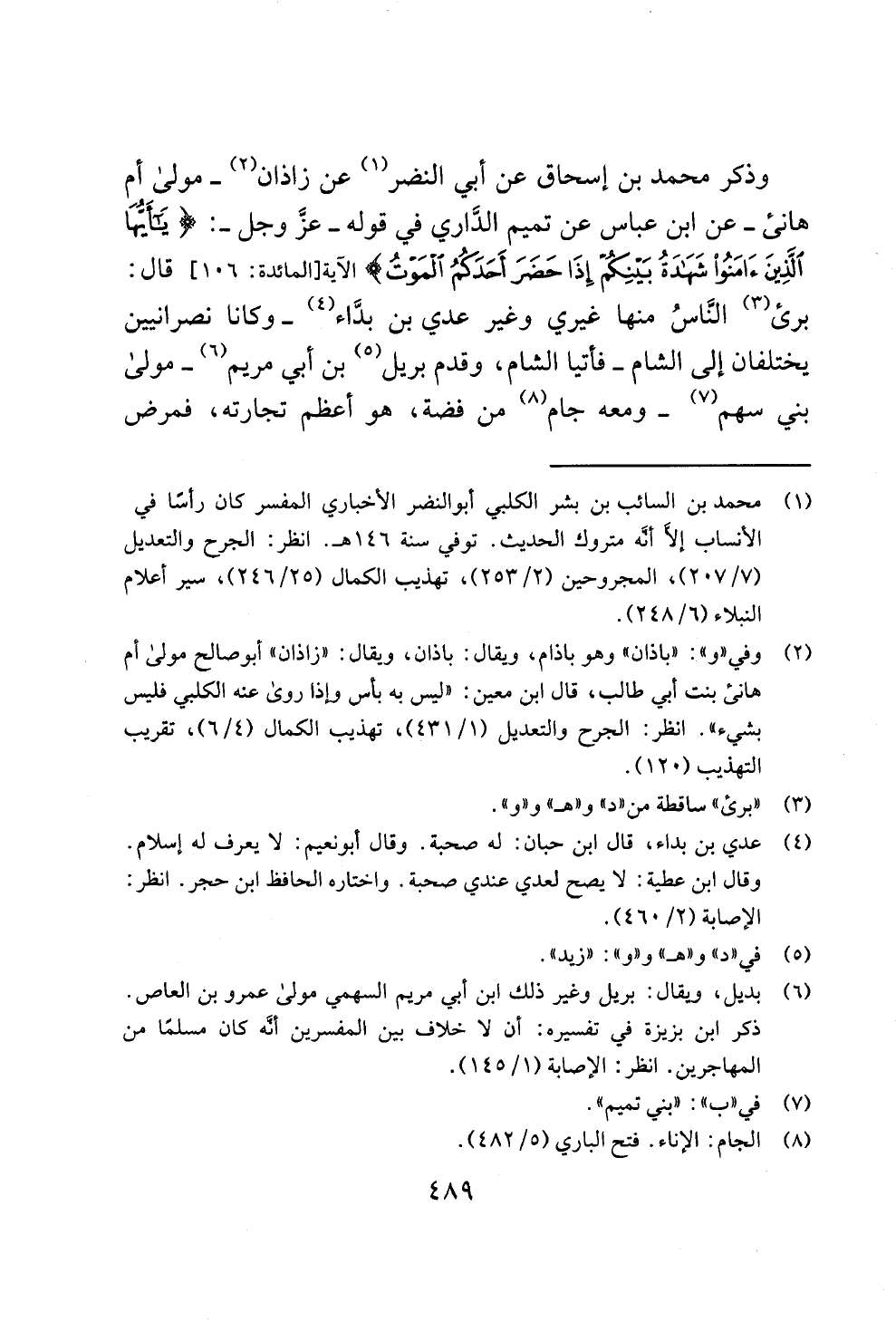 وذكر محمد بن إسحاق عن أبي النضر (¬1) عن زاذان (¬2) - مولى أم هانئ - عن ابن عباس عن تميم الدَّاري في قوله - عزَّ وجل -: {يَاأَيُّهَا الَّذِينَ آمَنُوا شَهَادَةُ بَيْنِكُمْ إِذَا حَضَرَ أَحَدَكُمُ الْمَوْتُ} [المائدة: 106] قال: برئ (¬3) النَّاسُ منها غيري وغير عدي بن بدَّاء (¬4) - وكانا نصرانيين يختلفان إلى الشام - فأتيا الشام، وقدم بريل (¬5) بن أبي مريم (¬6) - مولى بني سهم (¬7) - ومعه جام (¬8) من فضة، هو أعظم تجارته، فمرض