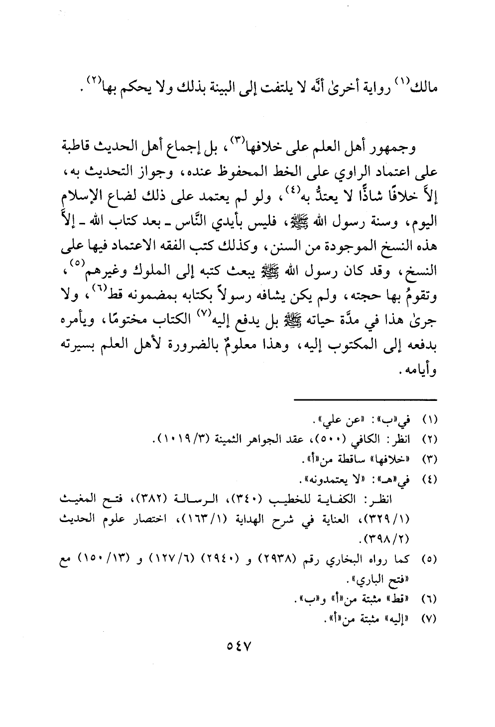 وجمهور أهل العلم على خلافها (¬3)، بل إجماع أهل الحديث قاطبة على اعتماد الراوي على الخط المحفوظ عنده، وجواز التحديث به، إلَّا خلافًا شاذًّا لا يعتدُّ به (¬4)، ولو لم يعتمد على ذلك لضاع الإسلام اليوم، وسنة رسول الله - صلى الله عليه وسلم -، فليس بأيدي النَّاس - بعد كتاب الله - إلَّا هذه النسخ الموجودة من السنن، وكذلك كتب الفقه الاعتماد فيها على النسخ، وقد كان رسول الله - صلى الله عليه وسلم - يبعث كتبه إلى الملوك وغيرهم (¬5)، وتقومُ بها حجته، ولم يكن يشافه رسولًا بكتابه بمضمونه قط (¬6)، ولا جرى هذا في مدَّة حياته - صلى الله عليه وسلم - بل يدفع إليه (¬7) الكتاب مختومًا، ويأمره بدفعه إلى المكتوب إليه، وهذا معلومٌ بالضرورة لأهل العلم بسيرته وأيامه.