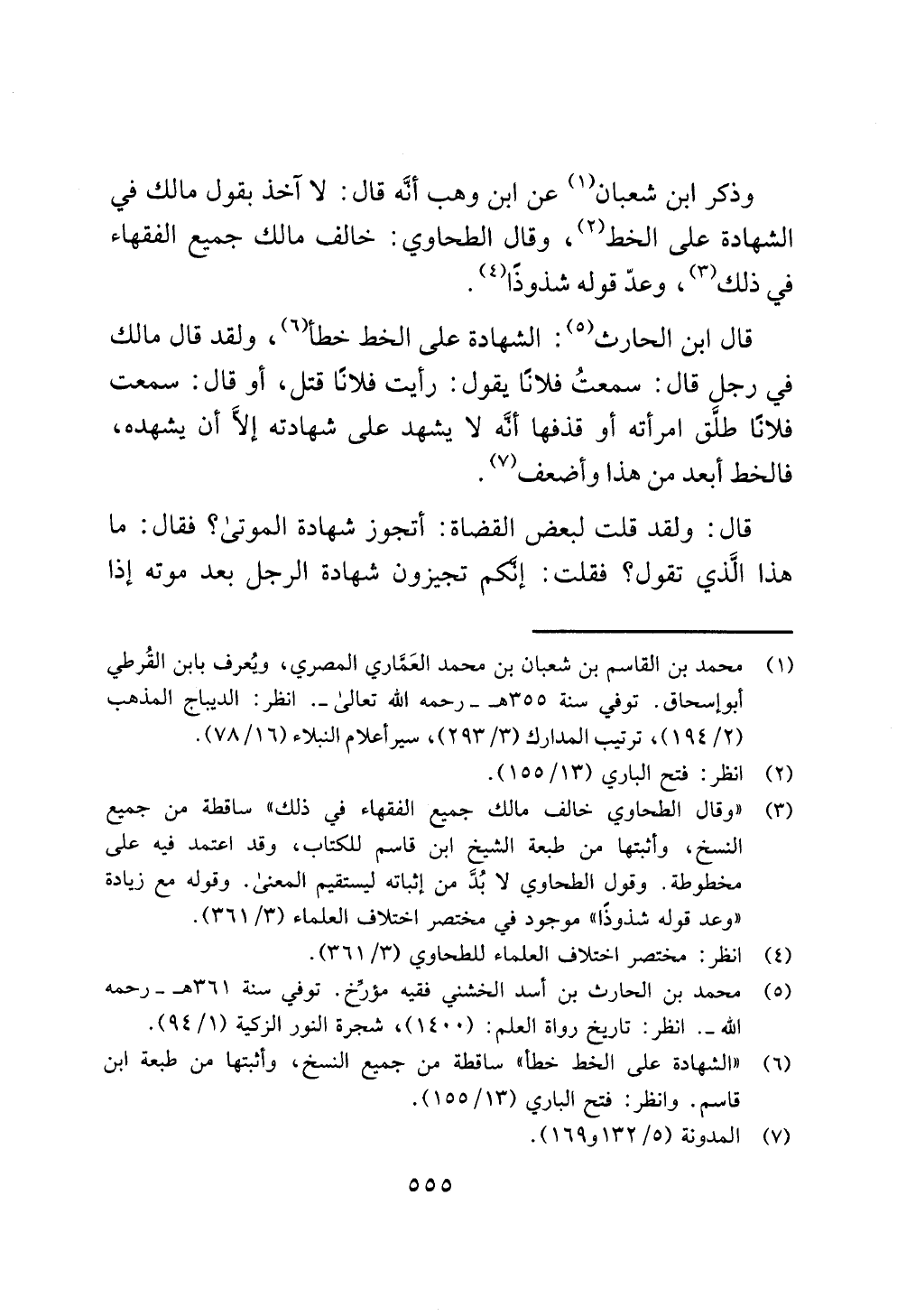 وذكر ابن شعبان (¬1) عن ابن وهب أنَّه قال: لا آخذ بقول مالك في الشهادة على الخط (¬2)، وقال الطحاوي: خالف مالك جميع الفقهاء في ذلك (¬3)، وعدّ قوله شذوذًا (¬4).