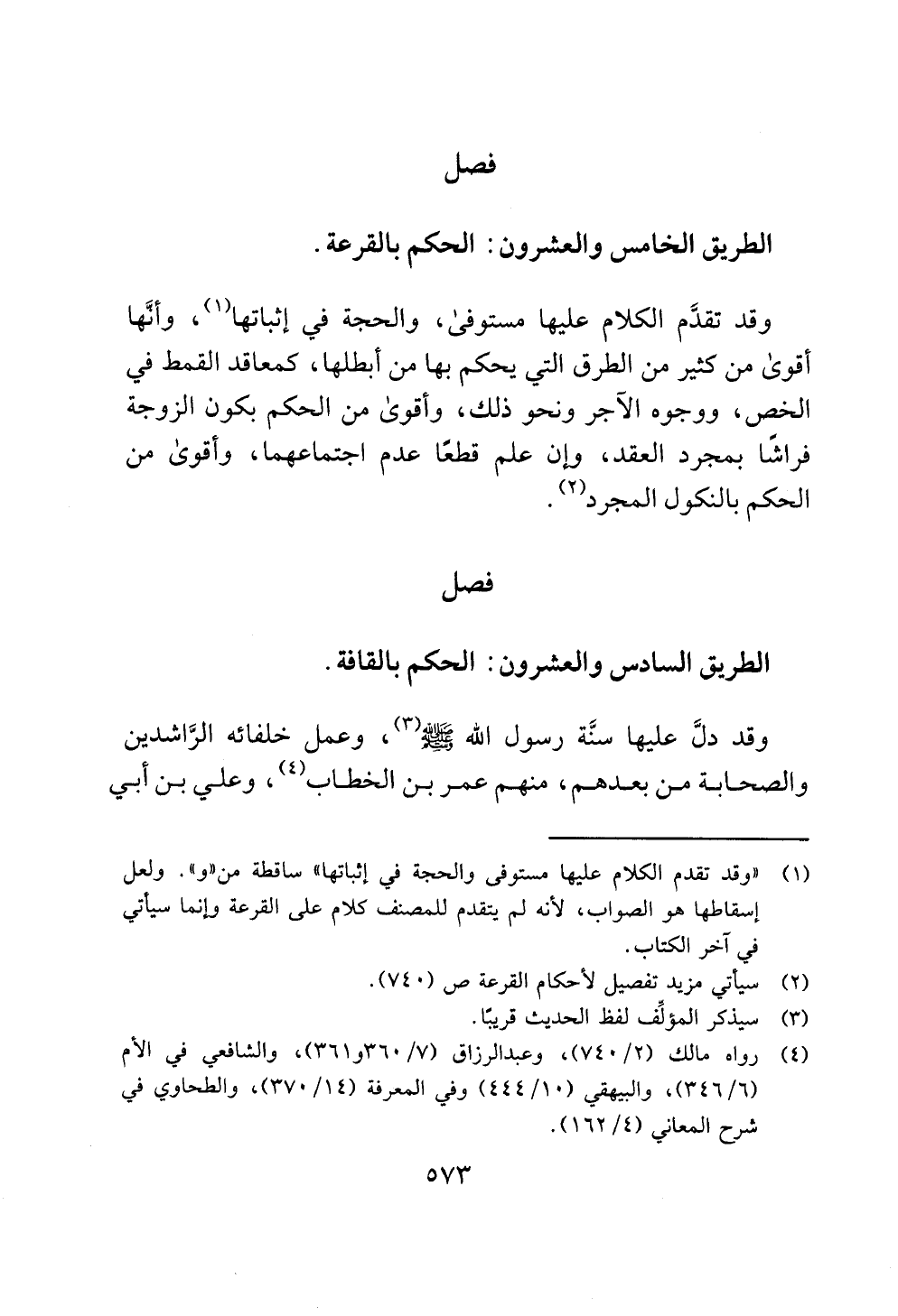 (¬1) "وقد تقدم الكلام عليها مستوفى والحجة في إثباتها" ساقطة من "و". ولعل إسقاطها هو الصواب، لأنه لم يتقدم للمصنف كلام على القرعة وإنما سيأتي في آخر الكتاب.