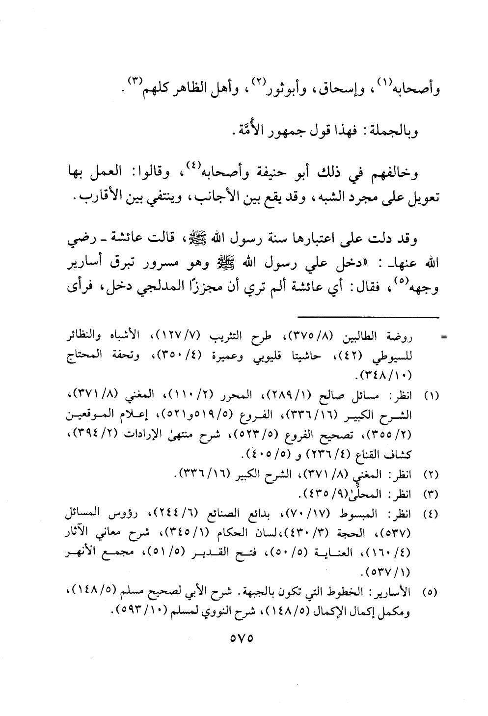 وقد دلت على اعتبارها سنة رسول الله - صلى الله عليه وسلم -، قالت عائشة - رضي الله عنها -: "دخل علي رسول الله - صلى الله عليه وسلم - وهو مسرور تبرق أسارير وجهه (¬5)، فقال: أي عائشة ألم تري أن مجززًا المدلجي دخل، فرأى