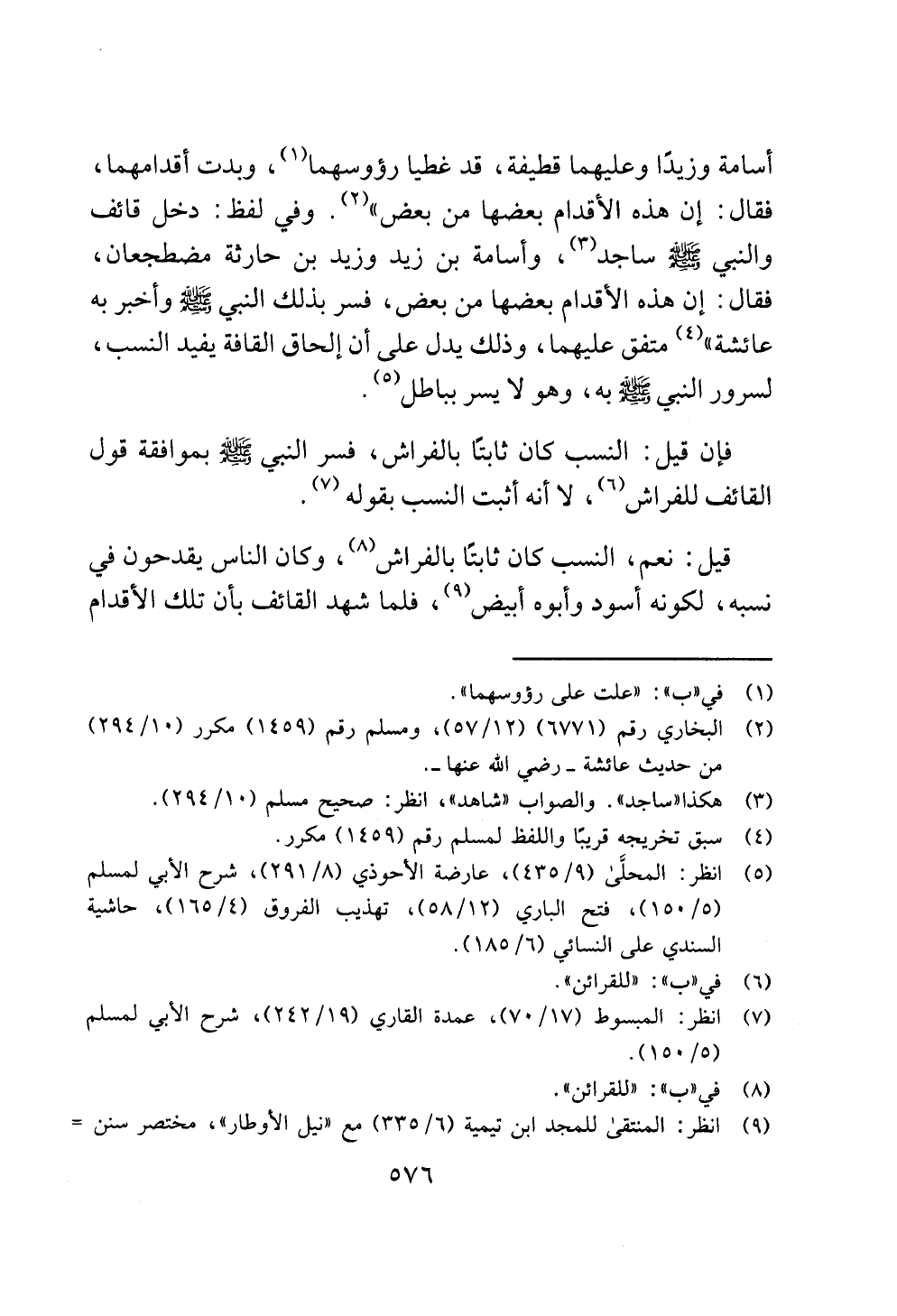 قيل: نعم، النسب كان ثابتًا بالفراش (¬8)، وكان الناس يقدحون في نسبه، لكونه أسود وأبوه أبيض (¬9)، فلما شهد القائف بأن تلك الأقدام