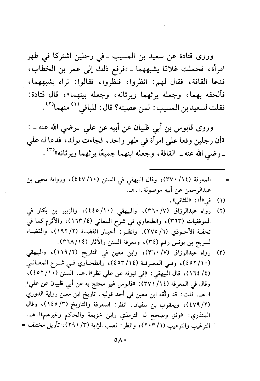 وروى قابوس بن أبي ظبيان عن أبيه عن علي - رضي الله عنه -: "أن رجلين وقعا على امرأة في طهر واحد، فجاءت بولد، فدعا له علي - رضي الله عنه - القافة، وجعله ابنهما جميعًا يرثهما ويرثانه" (¬3).