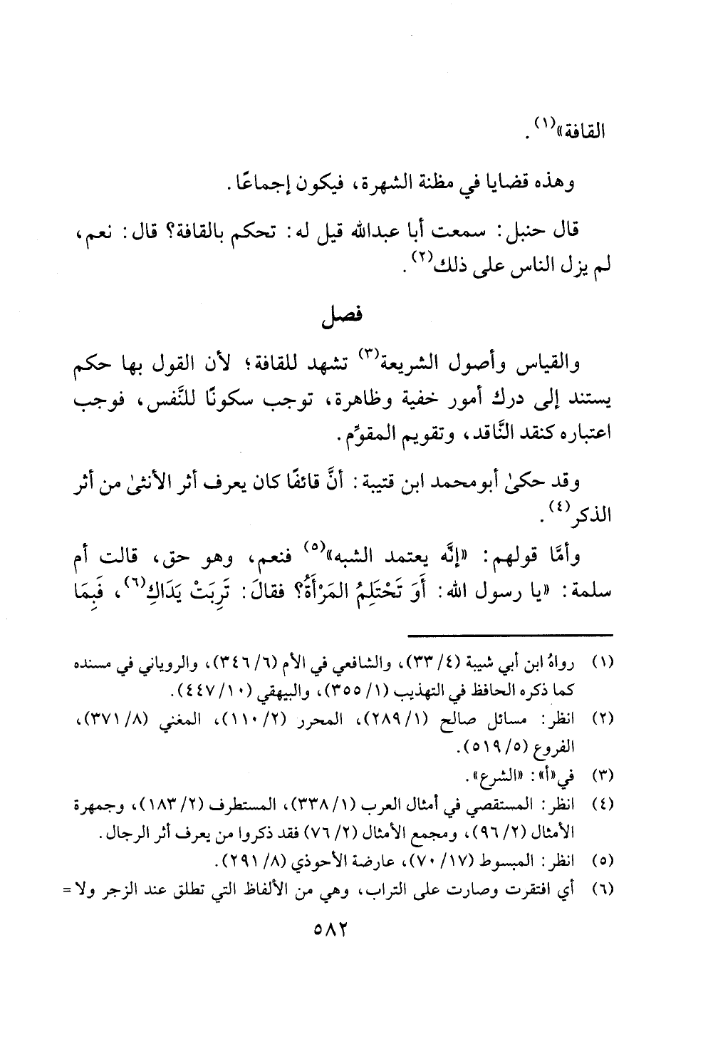 والقياس وأصول الشريعة (¬3) تشهد للقافة؛ لأن القول بها حكم يستند إلى درك أمور خفية وظاهرة، توجب سكونًا للنَّفس، فوجب اعتباره كنقد النَّاقد، وتقويم المقوِّم.