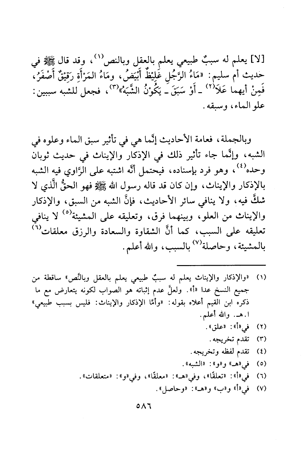 (¬1) "والإذكار والإيناث يعلم له سببٌ طبيعي يعلم بالعقل وبالنَّص" ساقطة من جميع النسخ عدا "أ". ولعلَّ عدم إثباته هو الصواب لكونه يتعارض مع ما ذكره ابن القيم أعلاه بقوله: "وأمَّا الإذكار والايناث: فليس بسبب طبيعي" ا. هـ. والله أعلم.