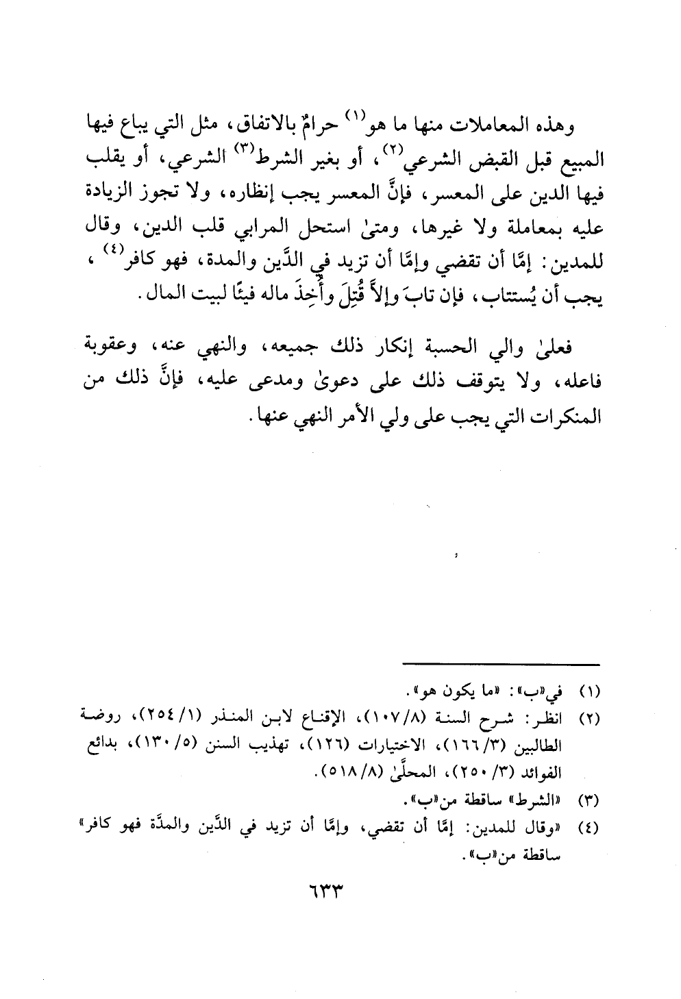 وهذه المعاملات منها ما هو (¬1) حرامٌ بالاتفاق، مثل التي يباع فيها المبيع قبل القبض الشرعي (¬2)، أو بغير الشرط (¬3) الشرعي، أو يقلب فيها الدين على المعسر، فإنَّ المعسر يجب إنظاره، ولا تجوز الزيادة عليه بمعاملة ولا غيرها، ومتى استحل المرابي قلب الدين، وقال للمدين: إمَّا أن تقضي وإمَّا أن تزيد في الدَّين والمدة، فهو كافر (¬4)، يجب أن يُستتاب، فإن تابَ وإلَّا قُتِلَ وأُخِذَ ماله فيئًا لبيت المال.