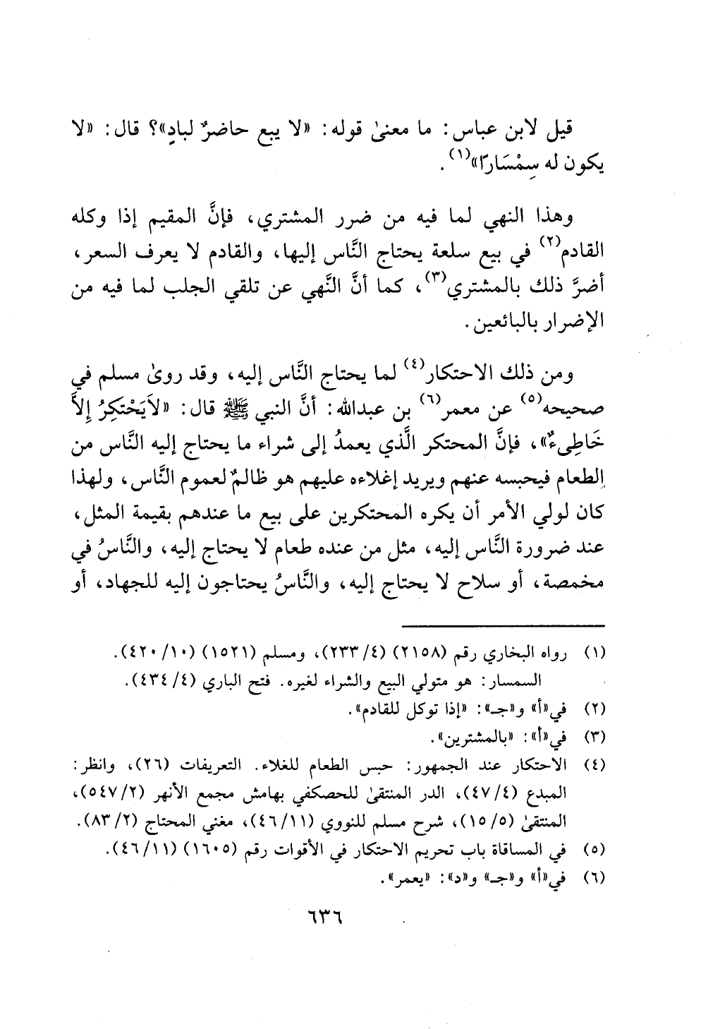(¬4) الاحتكار عند الجمهور: حبس الطعام للغلاء. التعريفات (26)، وانظر: المبدع (4/ 47)، الدر المنتقى للحصكفي بهامش مجمع الأنهر (2/ 547)، المنتقى (5/ 15)، شرح مسلم للنووي (11/ 46)، مغني المحتاج (2/ 83).