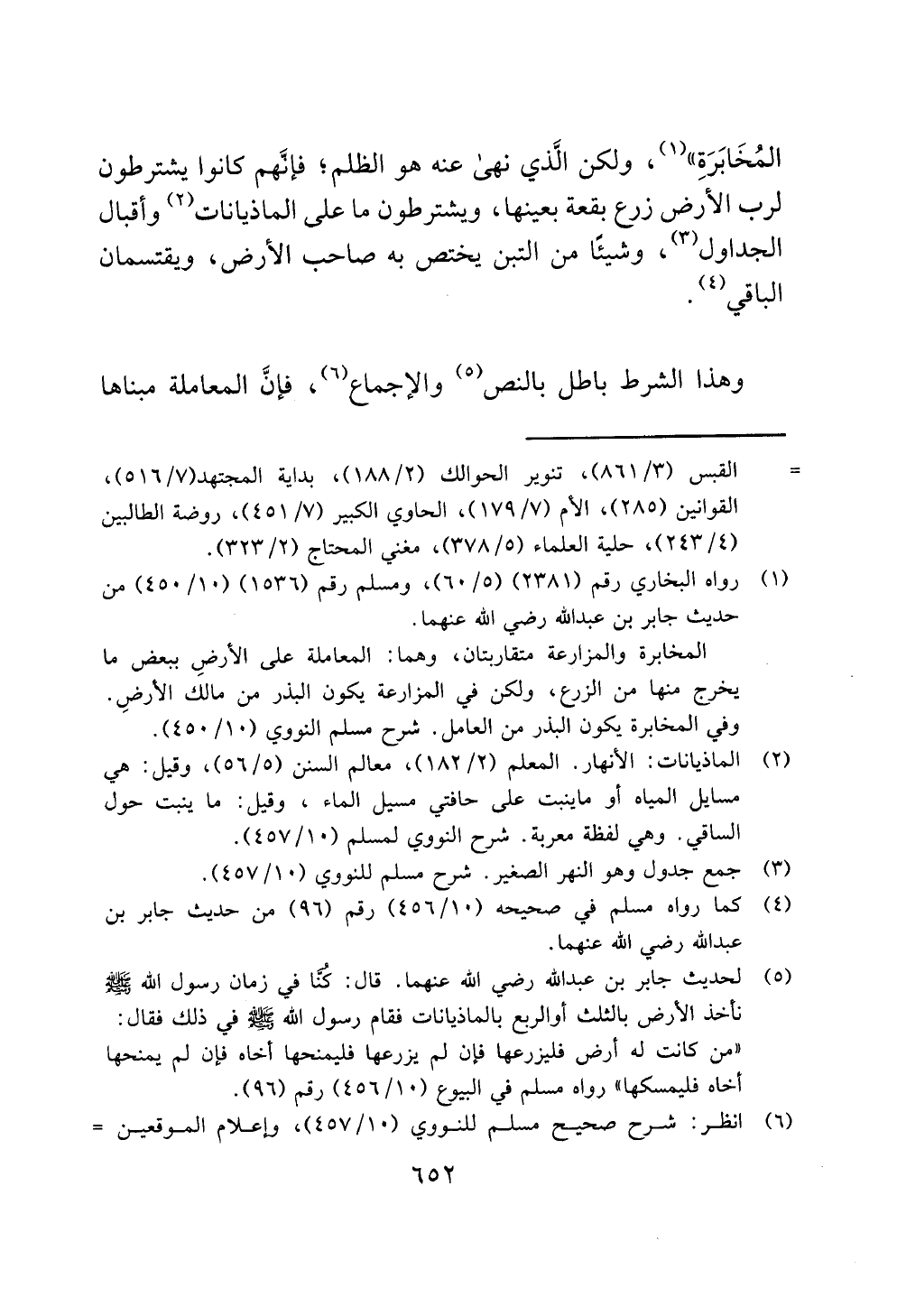 (¬5) لحديث جابر بن عبد الله رضي الله عنهما. قال: كُنَّا في زمان رسول الله - صلى الله عليه وسلم - نأخذ الأرض بالثلث أو الربع بالماذيانات فقام رسول الله - صلى الله عليه وسلم - في ذلك فقال: "من كانت له أرض فليزرعها فإن لم يزرعها فليمنحها أخاه فإن لم يمنحها أخاه فليمسكها" رواه مسلم في البيوع (10/ 456) رقم (96).