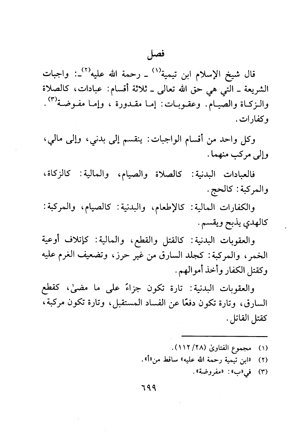 قال شيخ الإسلام ابن تيمية (¬1) - رحمة الله عليه (¬2) -: واجبات الشريعة - التي هي حق الله تعالى - ثلاثة أقسام: عبادات، كالصلاة والزكاة والصيام. وعقوبات: إما مقدورة، وإما مفوضة (¬3). وكفارات.