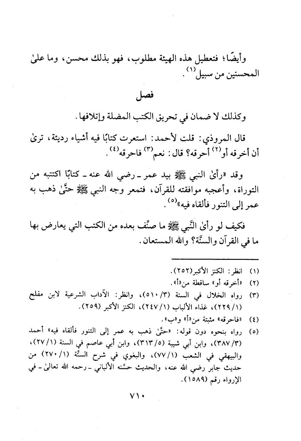 (¬5) رواه بنحوه دون قوله: "حتَّى ذهب به عمر إلى التنور فألقاه فيه" أحمد (3/ 387)، وابن أبي شيبة (5/ 313)، وابن أبي عاصم في السنة (1/ 27)، والبيهقي في الشعب (1/ 77)، والبغوي في شرح السنَّة (1/ 270) من حديث جابر رضي الله عنه، والحديث حسَّنه الألباني - رحمه الله تعالى - في الإرواء رقم (1589).