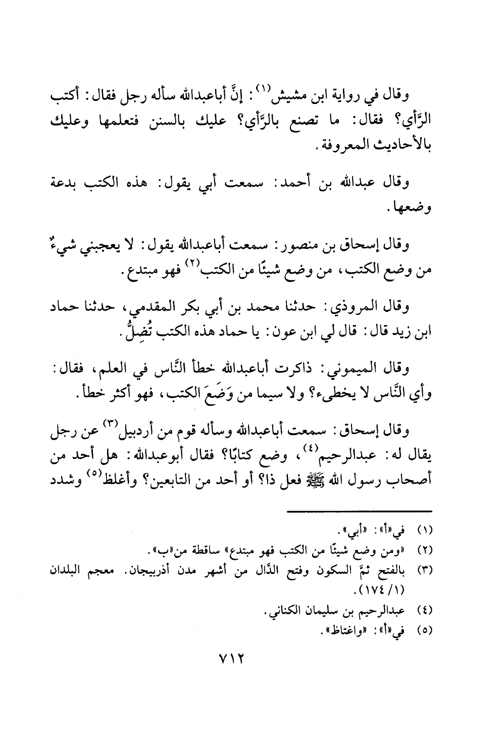 وقال إسحاق: سمعت أبا عبد الله وسأله قوم من أردبيل (¬3) عن رجل يقال له: عبد الرحيم (¬4)، وضع كتابًا؟ فقال أبو عبد الله: هل أحد من أصحاب رسول الله - صلى الله عليه وسلم - فعل ذا؟ أو أحد من التابعين؟ وأغلظ (¬5) وشدد