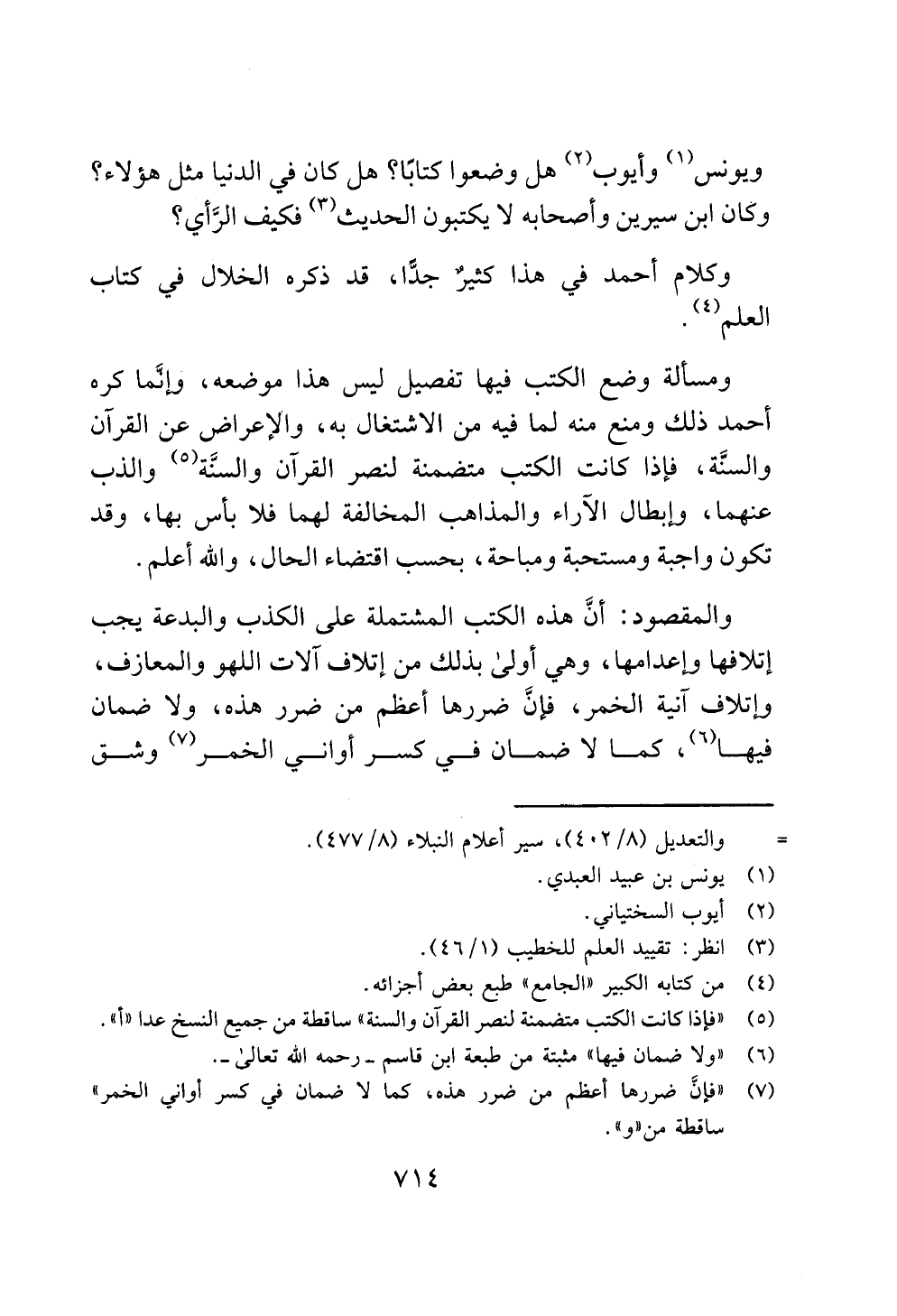ومسألة وضع الكتب فيها تفصيل ليس هذا موضعه، وإنَّما كره أحمد ذلك ومنع منه لما فيه من الاشتغال به، والإعراض عن القرآن والسنَّة، فإذا كانت الكتب متضمنة لنصر القرآن والسنَّة (¬5) والذب عنهما، وإبطال الآراء والمذاهب المخالفة لهما فلا بأس بها، وقد تكون واجبة ومستحبة ومباحة، بحسب اقتضاء الحال، والله أعلم.
