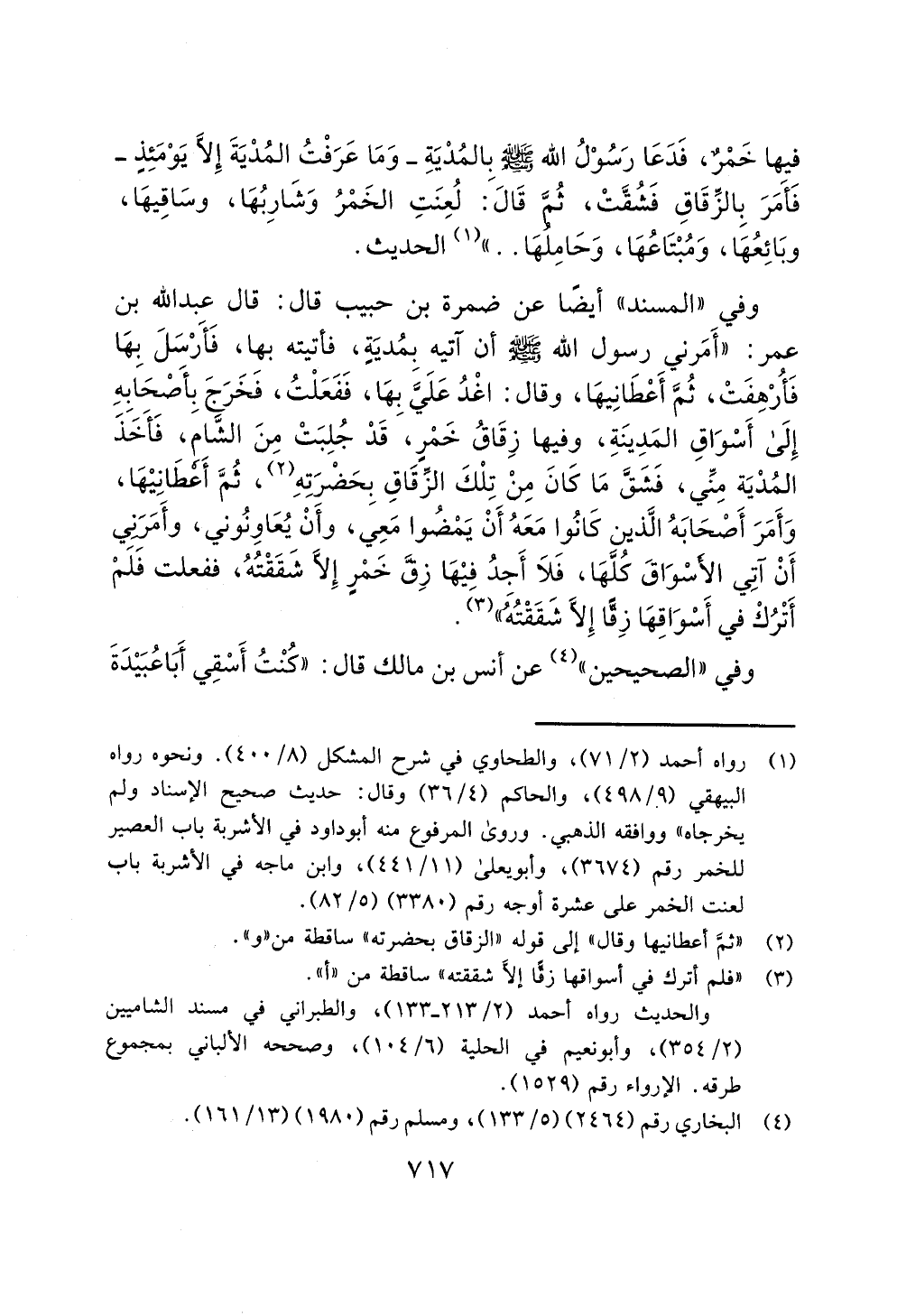 وفي "المسند" أيضًا عن ضمرة بن حبيب قال: قال عبد الله بن عمر: "أَمَرني رسول الله - صلى الله عليه وسلم - أن آتيه بمُديَةٍ، فأتيته بهِا، فَأرسَلَ بِهَا فَأُرْهِفَتْ، ثُمَّ أَعْطَانِيهَا، وقال: اغْدُ عَلَيَّ بِهَا، فَفَعَلْتُ، فخَرَجَ بِأَصْحَابِهِ إِلَى أَسْوَاقِ المَدِينَةِ، وفيها زِقَاقُ خَمْرٍ، قَدْ جُلِبَتْ مِنَ الشَّام، فَأخَذَ المُدْيَة مِنِّي، فَشَقَّ مَا كَانَ مِنْ تِلْكَ الزِّقَاقِ بحَضْرَتِهِ (¬2)، ثُمَّ أَعْطَانِيْهَا، وَأَمَرَ أَصْحَابَهُ الَّذين كَانُوا مَعَهُ أَنْ يَمْضُوا مَعِي، وأَنْ يُعَاوِنُوني، وأَمَرَنِي أَنْ آتِي الأسْوَاقَ كُلَّهَا، فَلَا أَجدُ فِيْهَا زِقَّ خَمْرٍ إِلَّا شَقَقْتُهُ، ففعلت فَلَمْ أَتْرُكْ في أَسْوَاقِهَا زِقًّا إِلَّا شَقَقْتُهُ" (¬3).