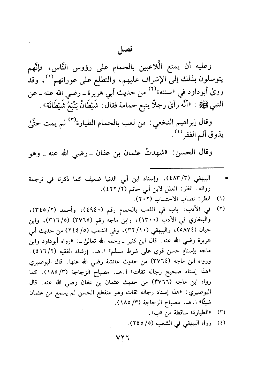 وعليه أن يمنع الَّلاعبين بالحمام على رؤوس النَّاس، فإنَّهم يتوسلون بذلك إلى الإشراف عليهم، والتطلع على عوراتهم (¬1)، وقد روى أبو داود في "سننه" (¬2) من حديث أبي هريرة - رضي الله عنه - عن النبي - صلى الله عليه وسلم -: "أنَّه رأى رجلًا يتبع حمامة فقال: شَيْطَانٌ يَتْبَعُ شَيْطَانَة".