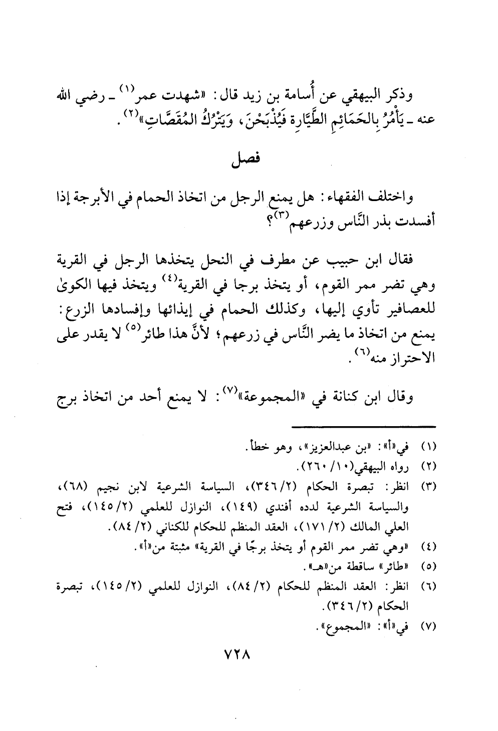 فقال ابن حبيب عن مطرف في النحل يتخذها الرجل في القرية وهي تضر ممر القوم، أو يتخذ برجا في القرية (¬4) ويتخذ فيها الكوى للعصافير تأوي إليها، وكذلك الحمام في إيذائها وإفسادها الزرع: يمنع من اتخاذ ما يضر النَّاس في زرعهم؛ لأنَّ هذا طائر (¬5) لا يقدر على الاحتراز منه (¬6).