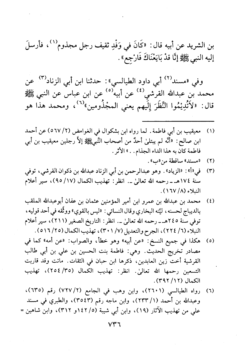 وفي "مسند (¬2) أبي داود الطيالسي": حدثنا ابن أبي الزناد (¬3) عن محمد بن عبد الله القرشي (¬4) عن أبيه (¬5) عن ابن عباس عن النبي - صلى الله عليه وسلم - قال: "لَا تُدِيْمُوا النَّظَرَ إِلَيهم يعني المجْذُومين" (¬6)، ومحمد هذا هو