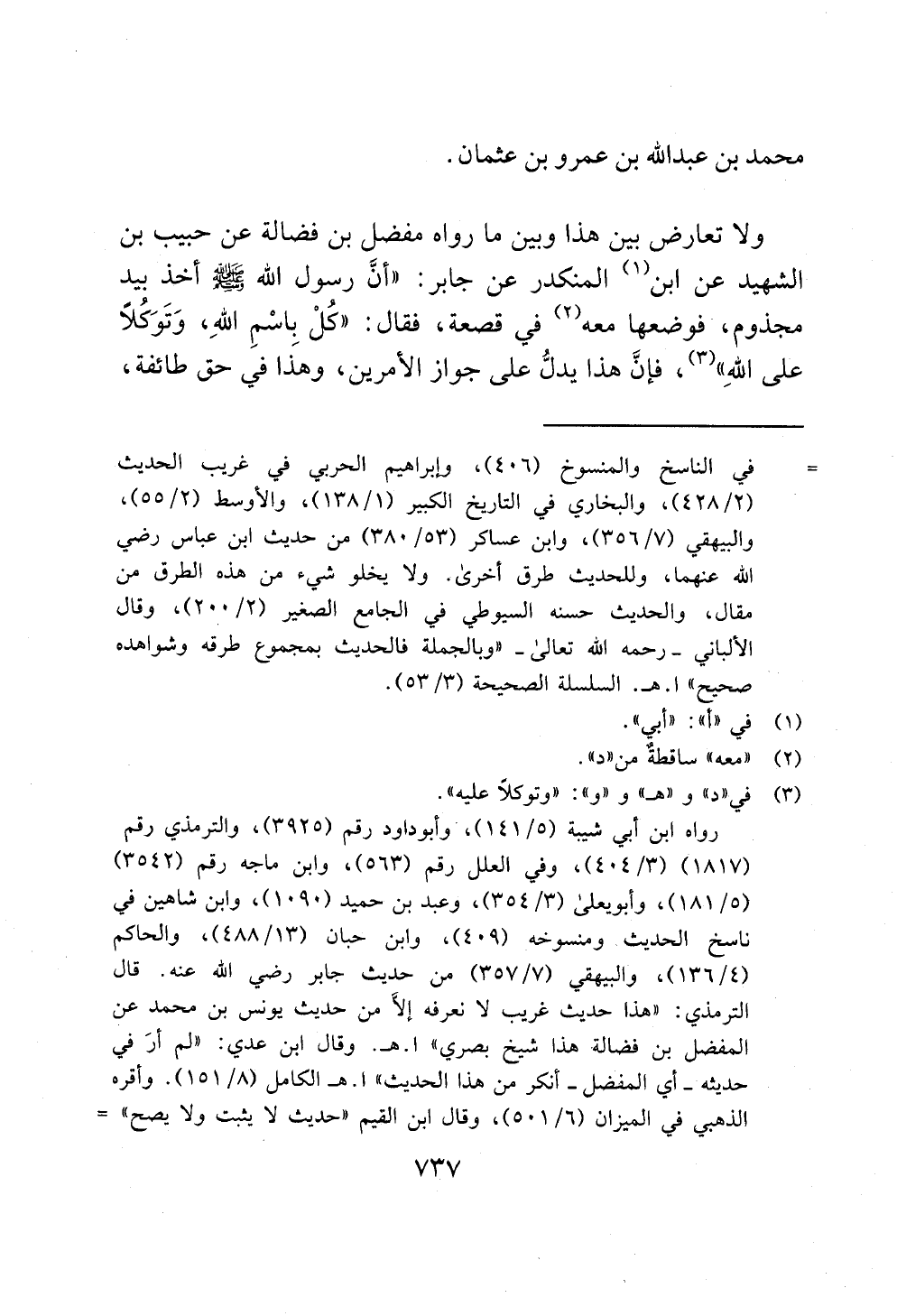 رواه ابن أبي شيبة (5/ 141)، وأبو داود رقم (3925)، والترمذي رقم (1817) (3/ 404)، وفي العلل رقم (563)، وابن ماجه رقم (3542) (5/ 181)، وأبو يعلى (3/ 354)، وعبد بن حميد (1090)، وابن شاهين في ناسخ الحديث ومنسوخه (409)، وابن حبان (13/ 488)، والحاكم (4/ 136)، والبيهقي (7/ 357) من حديث جابر رضي الله عنه. قال الترمذي: "هذا حديث غريب لا نعرفه إلَّا من حديث يونس بن محمد عن المفضل بن فضالة هذا شيخ بصري" ا. هـ. وقال ابن عدي: "لم أرَ في حديثه - أي المفضل - أنكر من هذا الحديث" ا. هـ الكامل (8/ 151). وأقره الذهبي في الميزان (6/ 501)، وقال ابن القيم "حديث لا يثبت ولا يصح" =
