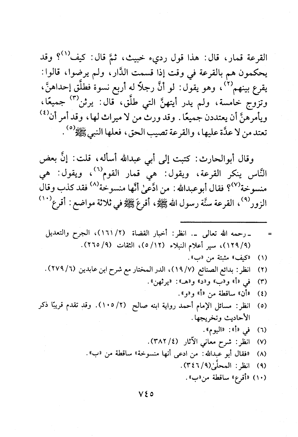 وقال أبو الحارث: كتبت إلى أبي عبد الله أسأله، قلت: إنَّ بعض النَّاس ينكر القرعة، ويقول: هي قمار القوم (¬6)، ويقول: هي منسوخة (¬7)؟ فقال أبو عبد الله: من ادَّعى أنَّها منسوخة (¬8) فقد كذب وقال الزور (¬9)، القرعة سنَّة رسول الله - صلى الله عليه وسلم -، أقرعَ - صلى الله عليه وسلم - في ثلاثة مواضع: أقرع (¬10)