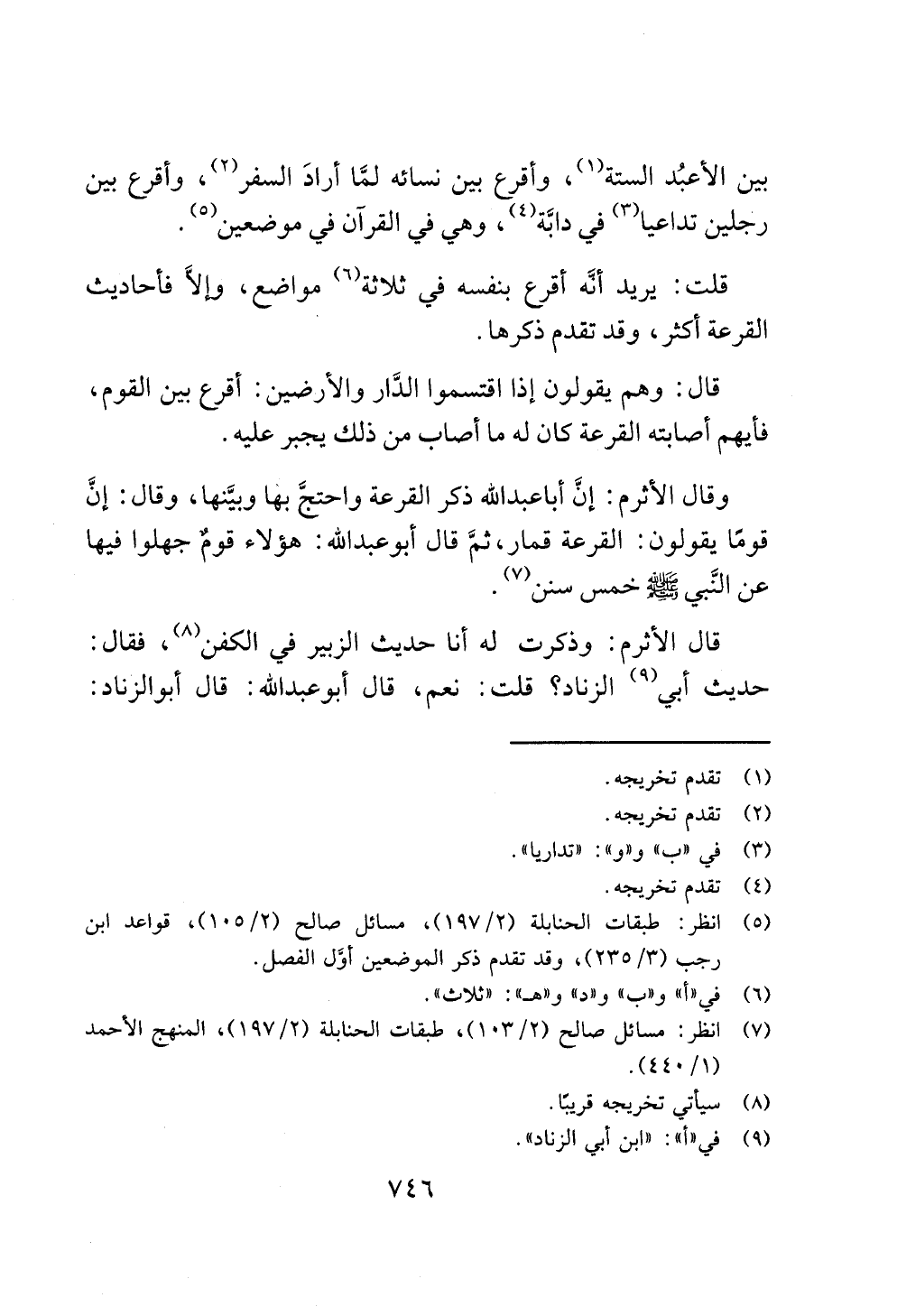 وقال الأثرم: إنَّ أبا عبد الله ذكر القرعة واحتجَّ بها وبيَّنها، وقال: إنَّ قومًا يقولون: القرعة قمار، ثمَّ قال أبو عبد الله: هؤلاء قومٌ جهلوا فيها عن النَّبي - صلى الله عليه وسلم - خمس سنن (¬7).