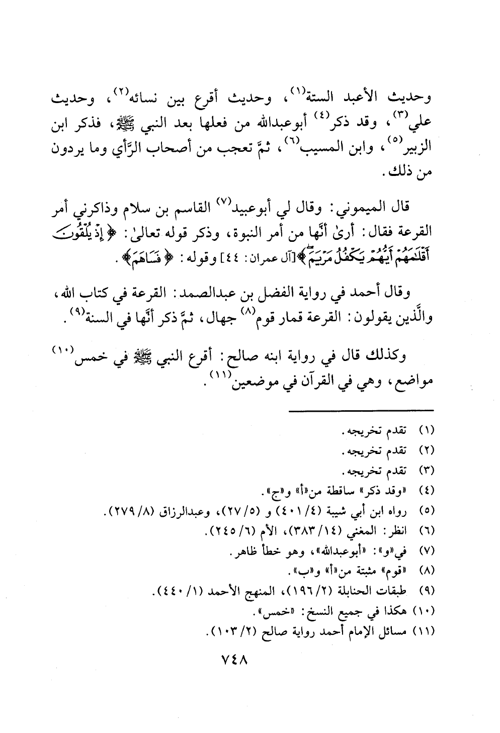 وكذلك قال في رواية ابنه صالح: أقرع النبي - صلى الله عليه وسلم - في خمس (¬10) مواضع، وهي في القرآن في موضعين (¬11).