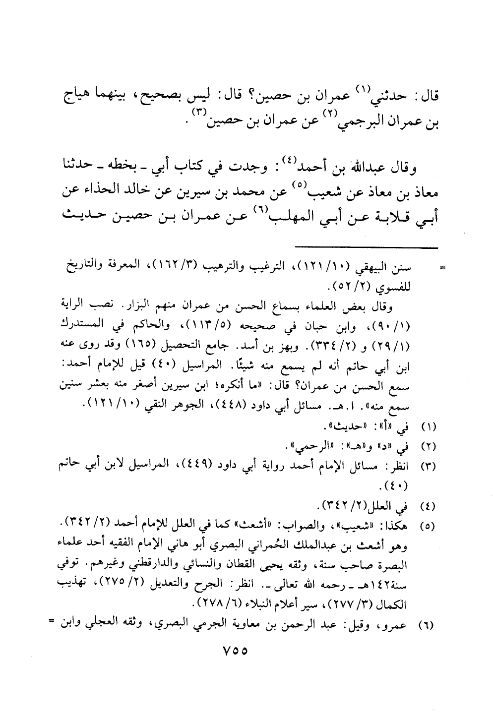 وقال عبد الله بن أحمد (¬4): وجدت في كتاب أبي - بخطه - حدثنا معاذ بن معاذ عن شعيب (¬5) عن محمد بن سيرين عن خالد الحذاء عن أبي قلابة عن أبي المهلب (¬6) عن عمران بن حصين حديث