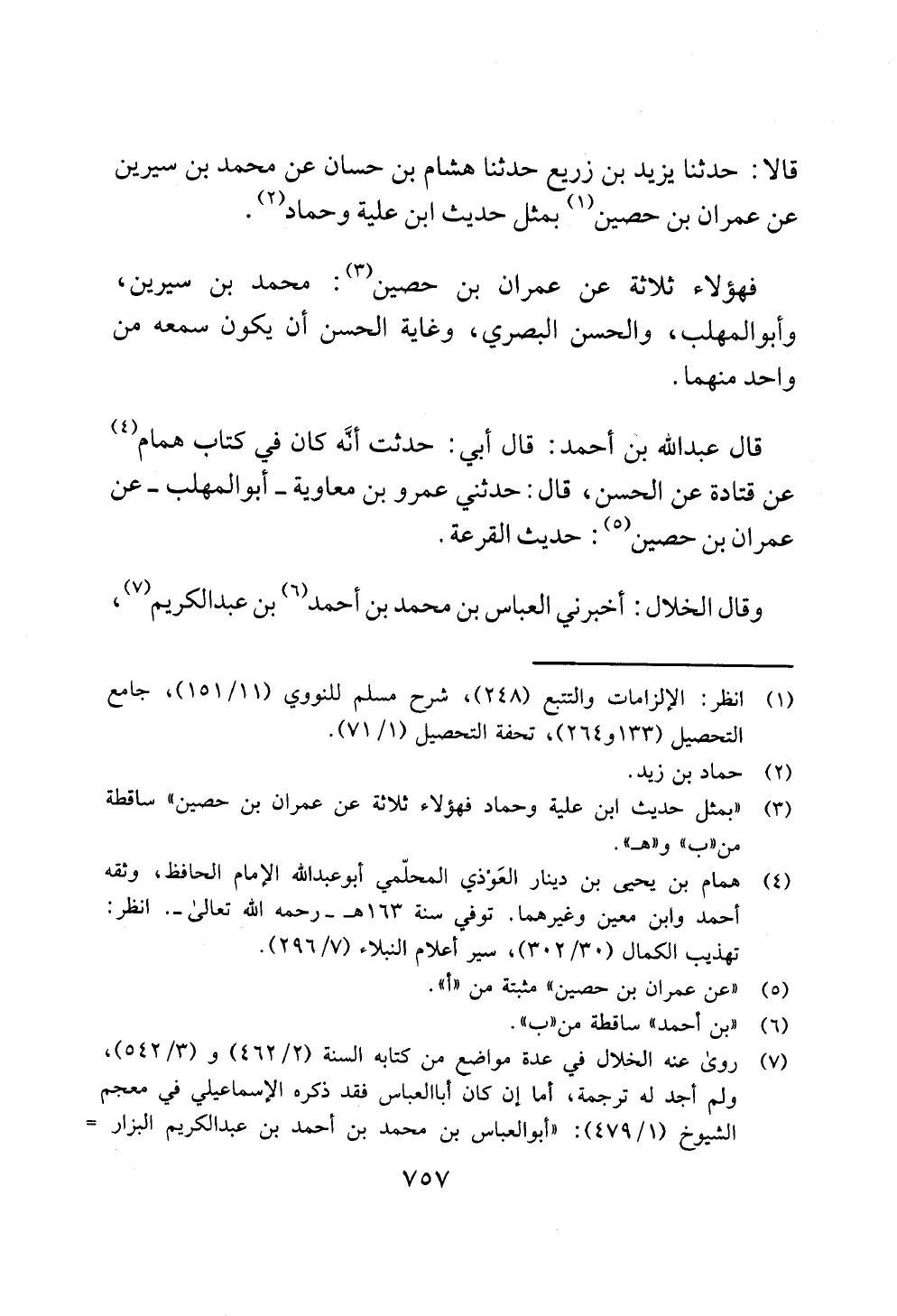قالا: حدثنا يزيد بن زريع حدثنا هشام بن حسان عن محمد بن سيرين عن عمران بن حصين (¬1) بمثل حديث ابن علية وحماد (¬2).