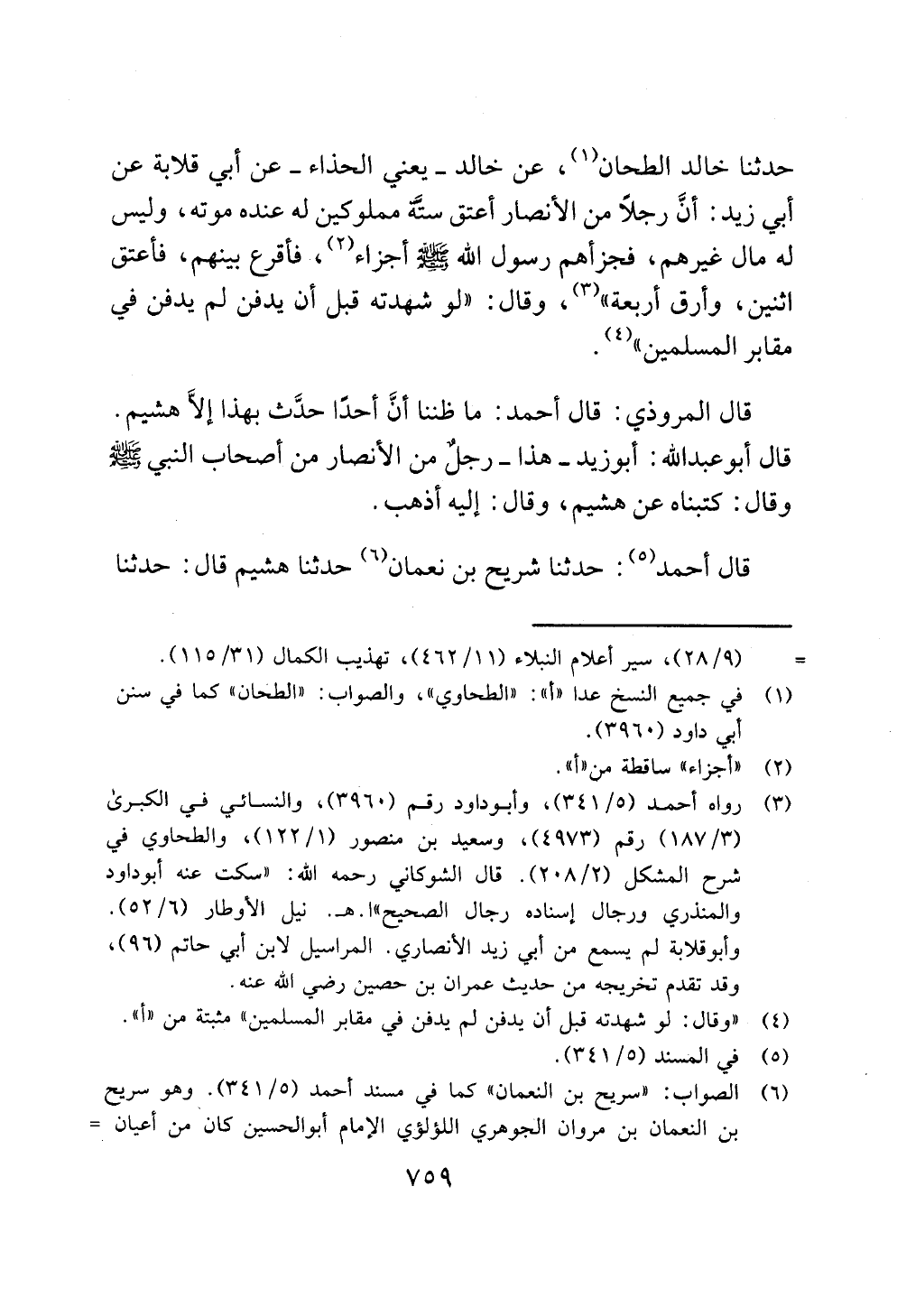 قال المروذي: قال أحمد: ما ظننا أنَّ أحدًا حدَّث بهذا إِلَّا هشيم. قال أبو عبد الله: أبو زيد - هذا - رجلٌ من الأنصار من أصحاب النبي - صلى الله عليه وسلم - وقال: كتبناه عن هشيم، وقال: إليه أذهب.