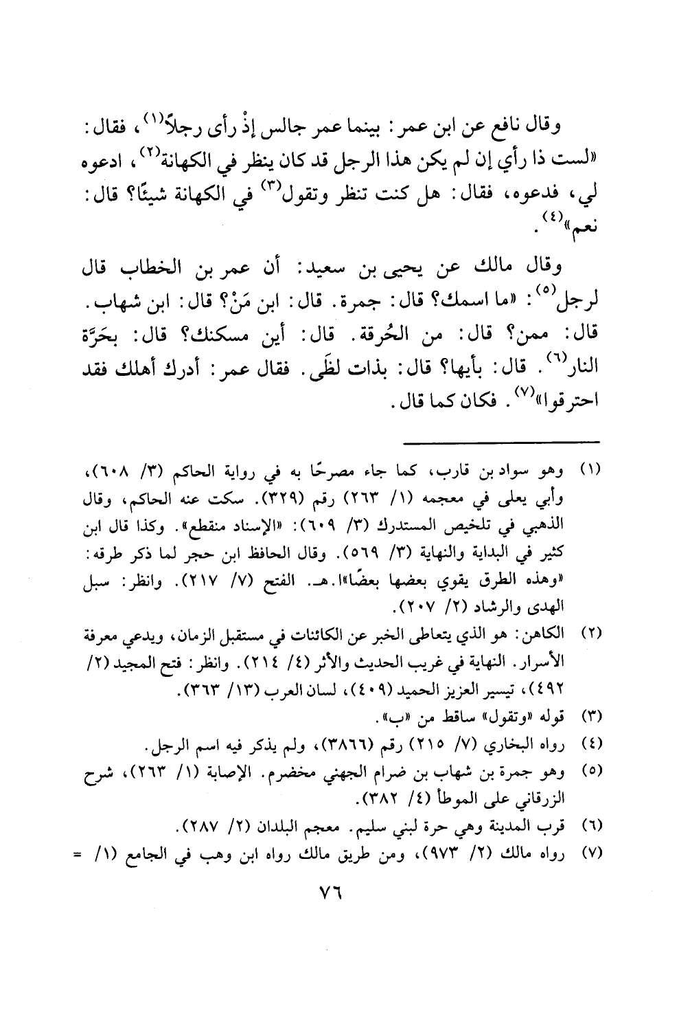 وقال نافع عن ابن عمر: بينما عمر جالس إذْ رأى رجلًا (¬1)، فقال: "لست ذا رأي إن لم يكن هذا الرجل قد كان ينظر في الكهانة (¬2)، ادعوه لي، فدعوه، فقال: هل كنت تنظر وتقول (¬3) في الكهانة شيئًا؟ قال: نعم" (¬4).