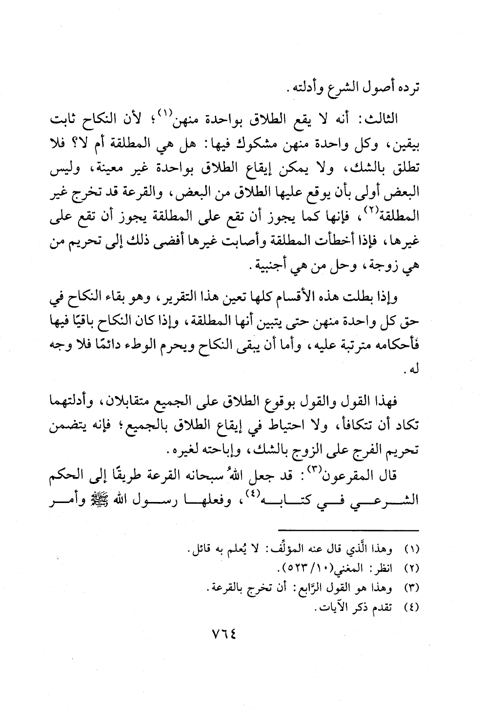 الثالث: أنه لا يقع الطلاق بواحدة منهن (¬1)؛ لأن النكاح ثابت بيقين، وكل واحدة منهن مشكوك فيها: هل هي المطلقة أم لا؟ فلا تطلق بالشك، ولا يمكن إيقاع الطلاق بواحدة غير معينة، وليس البعض أولى بأن يوقع عليها الطلاق من البعض، والقرعة قد تخرج غير المطلقة (¬2)، فإنها كما يجوز أن تقع على المطلقة يجوز أن تقع على غيرها، فإذا أخطأت المطلقة وأصابت غيرها أفضى ذلك إلى تحريم من هي زوجة، وحل من هي أجنبية.