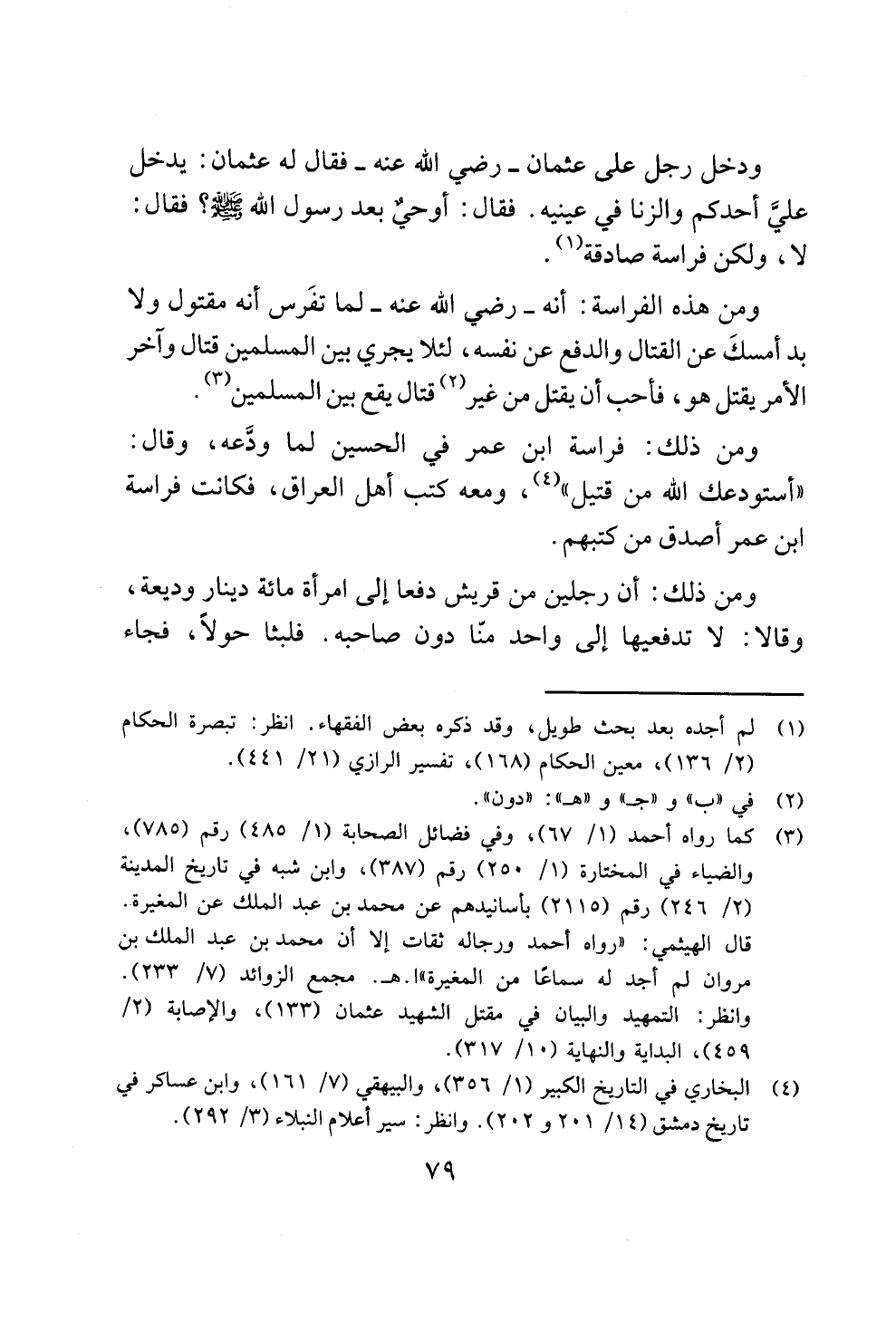 ومن هذه الفراسة: أنه - رضي الله عنه - لما تفَرس أنه مقتول ولا بد أمسكَ عن القتال والدفع عن نفسه، لئلا يجري بين المسلمين قتال وآخر الأمر يقتل هو، فأحب أن يقتل من غير (¬2) قتال يقع بين المسلمين (¬3).