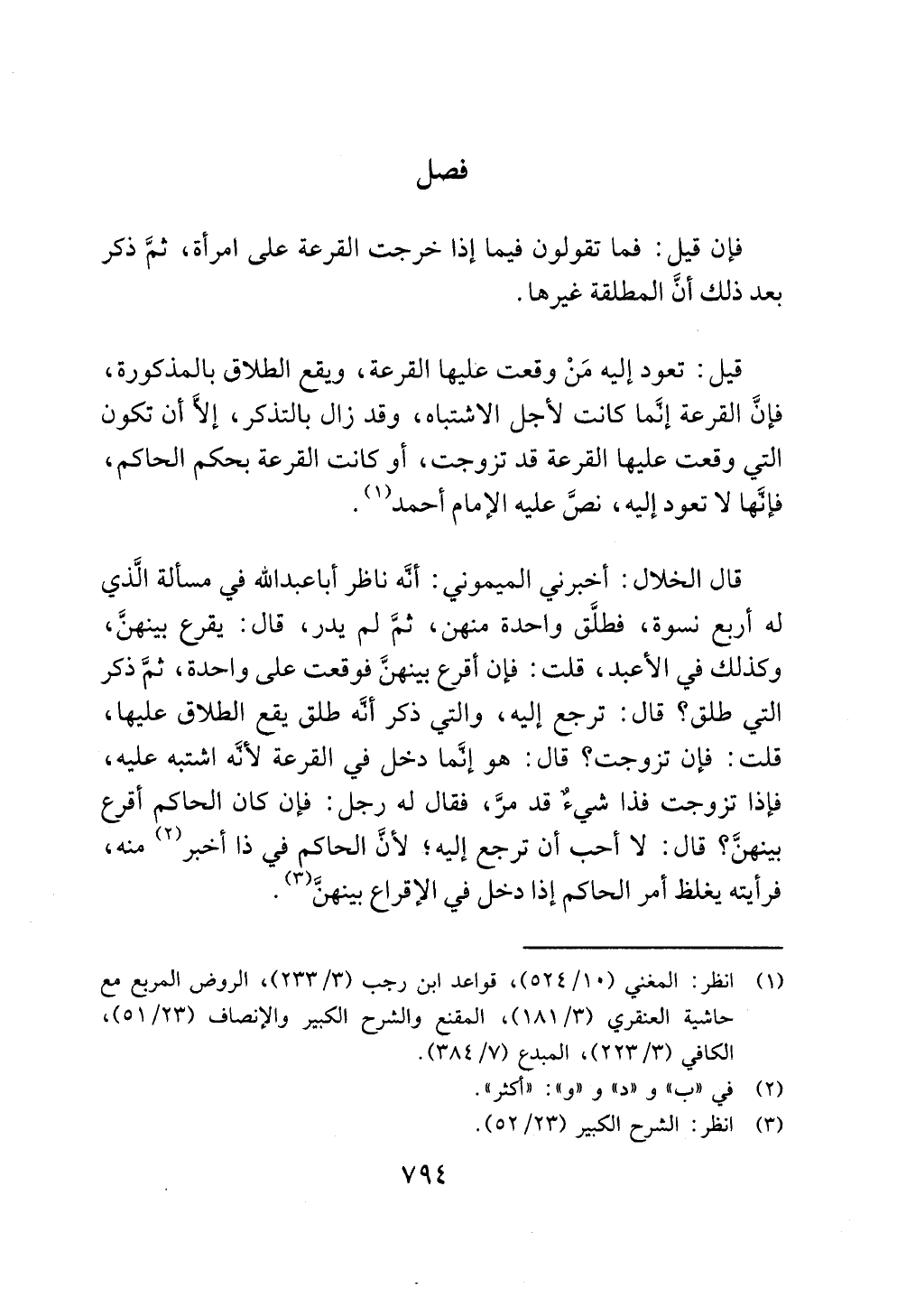 قال الخلال: أخبرني الميموني: أنَّه ناظر أبا عبد الله في مسألة الَّذي له أربع نسوة، فطلَّق واحدة منهن، ثمَّ لم يدر، قال: يقرع بينهنَّ، وكذلك في الأعبد، قلت: فإن أقرع بينهنَّ فوقعت على واحدة، ثمَّ ذكر التي طلق؟ قال: ترجع إليه، والتي ذكر أنَّه طلق يقع الطلاق عليها، قلت: فإن تزوجت؟ قال: هو إنَّما دخل في القرعة لأنَّه اشتبه عليه، فإذا تزوجت فذا شيءٌ قد مرَّ، فقال له رجل: فإن كان الحاكم أقرع بينهنَّ؟ قال: لا أحب أن ترجع إليه؛ لأنَّ الحاكم في ذا أخبر (¬2) منه، فرأيته يغلظ أمر الحاكم إذا دخل في الإقراع بينهنَّ (¬3).