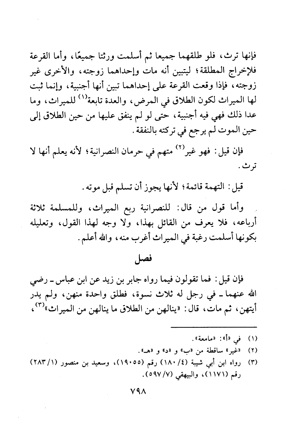 فإنها ترث، فلو طلقهما جميعا ثم أسلمت ورثتا جميعًا، وأما القرعة فلإخراج المطلقة؛ ليتبين أنَّه مات وإحداهما زوجته، والأخرى غير زوجته، فإذا وقعت القرعة على إحداهما تبين أنها أجنبية، وإنما ثبت لها الميراث لكون الطلاق في المرض، والعدة تابعة (¬1) للميراث، وما عدا ذلك فهي فيه أجنبية، حتَّى لو لم ينفق عليها من حين الطلاق إلى حين الموت لم يرجع في تركته بالنفقة.