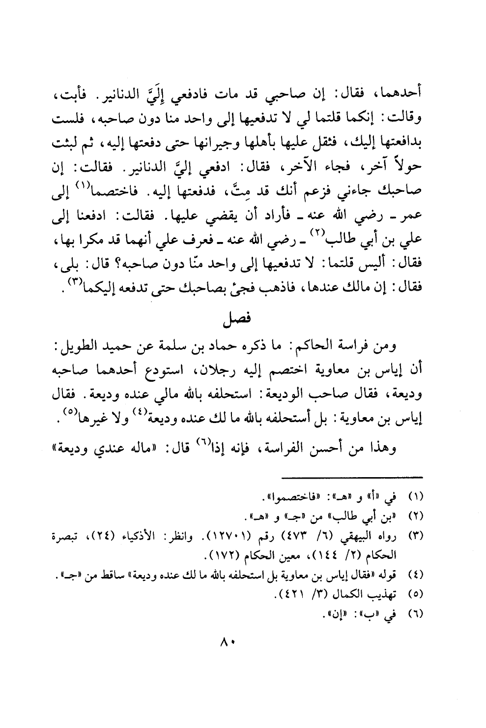 ومن فراسة الحاكم: ما ذكره حماد بن سلمة عن حميد الطويل: أن إياس بن معاوية اختصم إليه رجلان، استودع أحدهما صاحبه وديعة، فقال صاحب الوديعة: استحلفه بالله مالي عنده وديعة. فقال إياس بن معاوية: بل أستحلفه بالله مالك عنده وديعة (¬4) ولا غيرها (¬5).