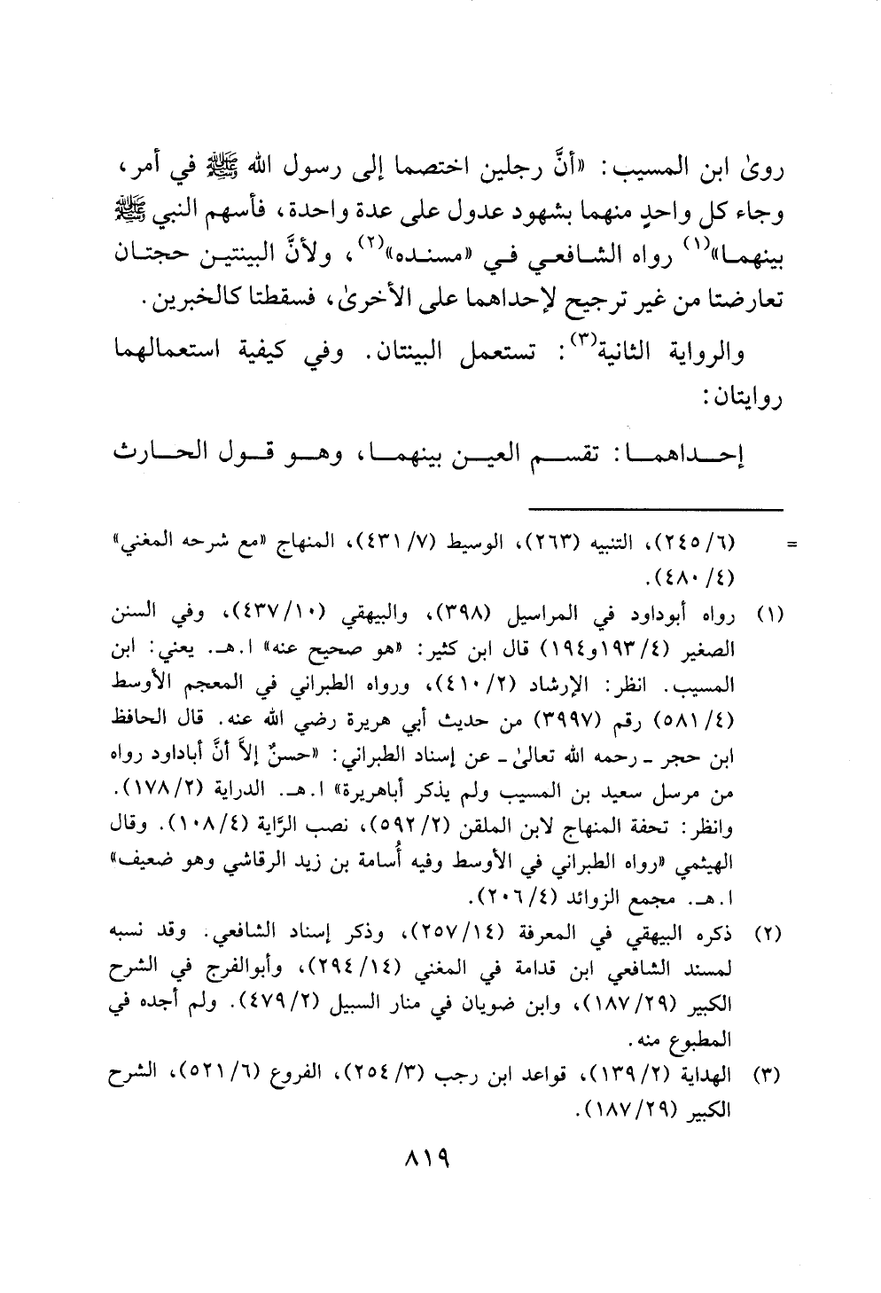 (¬1) رواه أبو داود في المراسيل (398)، والبيهقي (10/ 437)، وفي السنن الصغير (4/ 193 و 194) قال ابن كثير: "هو صحيح عنه" ا. هـ. يعني: ابن المسيب. انظر: الإرشاد (2/ 410)، ورواه الطبراني في المعجم الأوسط (4/ 581) رقم (3997) من حديث أبي هريرة رضي الله عنه. قال الحافظ ابن حجر - رحمه الله تعالى - عن إسناد الطبراني: "حسنٌ إلَّا أنَّ أبا داود رواه من مرسل سعيد بن المسيب ولم يذكر أبا هريرة" ا. هـ. الدراية (2/ 178). وانظر: تحفة المنهاج لابن الملقن (2/ 592)، نصب الرَّاية (4/ 108). وقال الهيثمي "رواه الطبراني في الأوسط وفيه أُسامة بن زيد الرقاشي وهو ضعيف" ا. هـ. مجمع الزوائد (4/ 206).