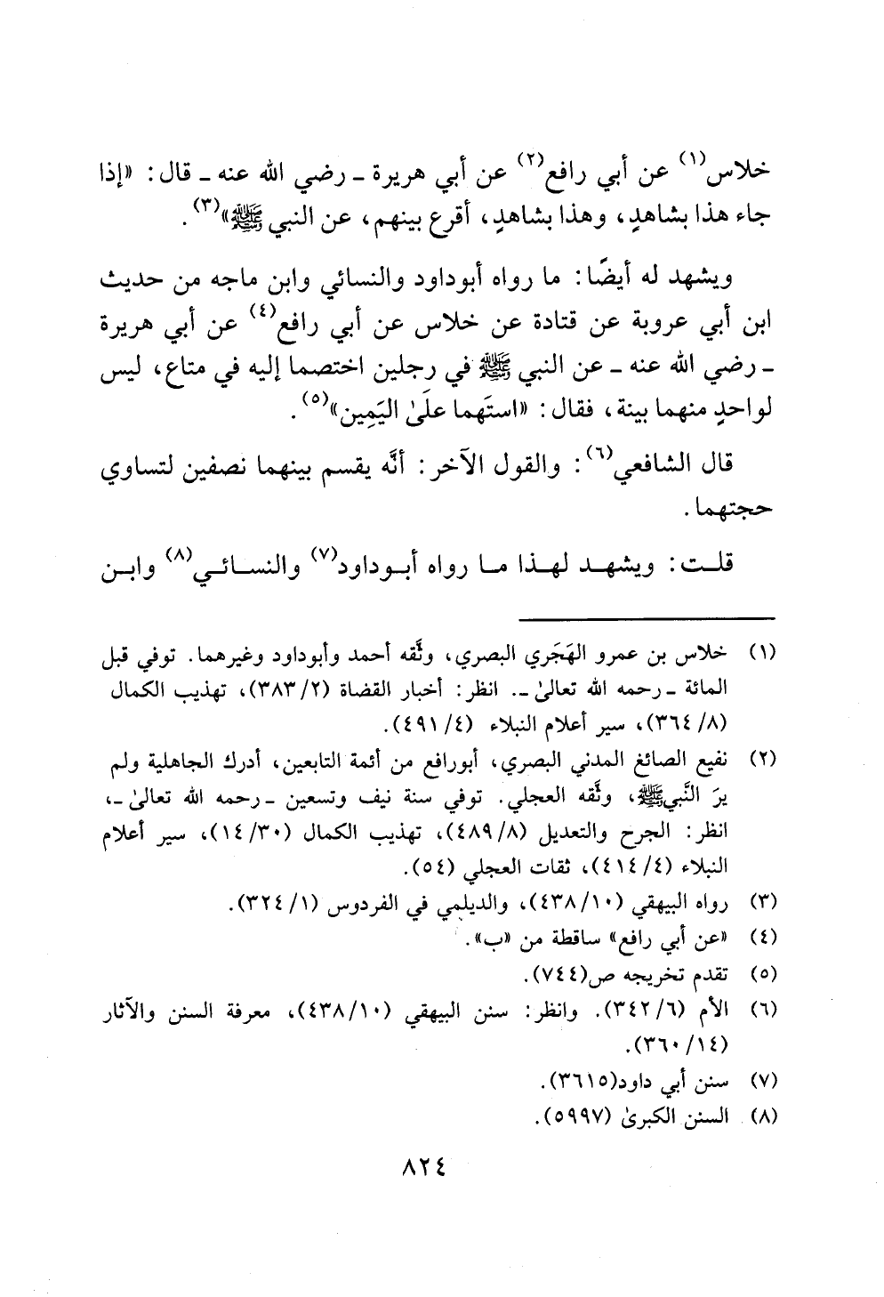 ويشهد له أيضًا: ما رواه أبو داود والنسائي وابن ماجه من حديث ابن أبي عروبة عن قتادة عن خلاس عن أبي رافع (¬4) عن أبي هريرة - رضي الله عنه - عن النبي - صلى الله عليه وسلم - في رجلين اختصما إليه في متاع، ليس لواحدٍ منهما بينة، فقال: "استَهما علَى اليَمِين" (¬5).