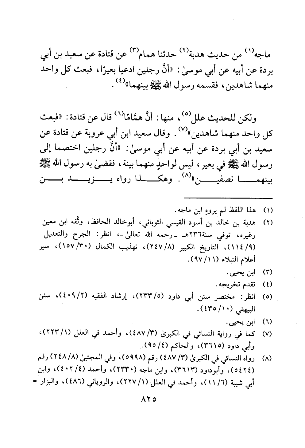 ولكن للحديث علل (¬5)، منها: أنَّ همَّامًا (¬6) قال عن قتادة: "فبعث كل واحد منهما شاهدين" (¬7). وقال سعيد ابن أبي عروبة عن قتادة عن سعيد بن أبي بردة عن أبيه عن أبي موسى: "أنَّ رجلين اختصما إلى رسول الله - صلى الله عليه وسلم - في بعير، ليس لواحدٍ منهما بينة، فقضى به رسول الله - صلى الله عليه وسلم - بينهما نصفين" (¬8). وهكذا رواه يزيد بن