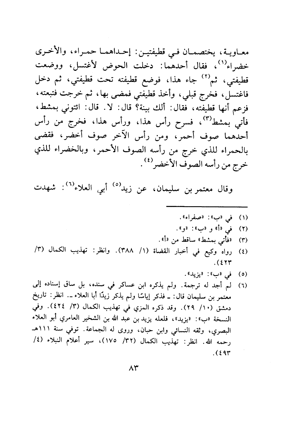 (¬6) لم أجد له ترجمة. ولم يذكره ابن عساكر في سنده، بل ساق إسناده إلى معتمر بن سليمان قال: - فذكر إياسًا ولم يذكر زيدًا أبا العلاء -. انظر: تاريخ دمشق (10/ 29). وقد ذكره المزي في تهذيب الكمال (3/ 424). وفي النسخة "ب": "يزيد"، فلعله يزيد بن عبد الله بن الشخير العامري أبو العلاء البصري، وثقه النسائي وابن حبان، وروى له الجماعة. توفي سنة 111 هـ رحمه الله. انظر: تهذيب الكمال (32/ 175)، سير أعلام النبلاء (4/ 493).