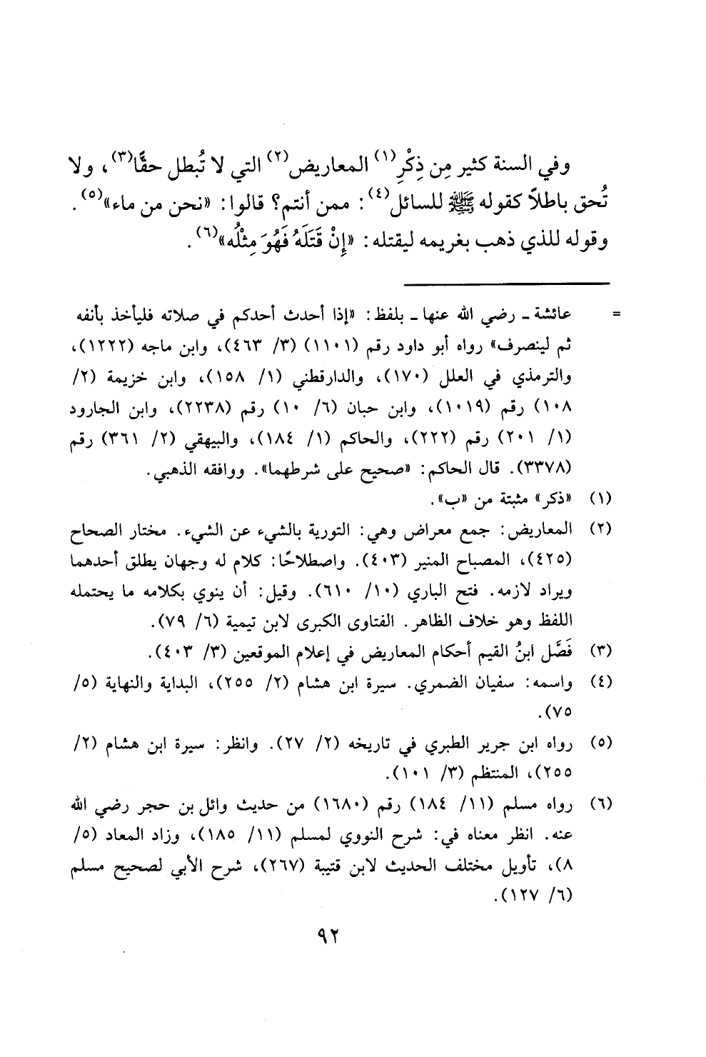 وفي السنة كثير مِن ذِكْرِ (¬1) المعاريض (¬2) التي لا تُبطل حقًّا (¬3)، ولا تُحق باطلًا كقوله - صلى الله عليه وسلم - للسائل (¬4): ممن أنتم؟ قالوا: "نحن من ماء" (¬5). وقوله للذي ذهب بغريمه ليقتله: "إِنْ قَتَلَهُ فهُوَ مِثْلُه" (¬6).