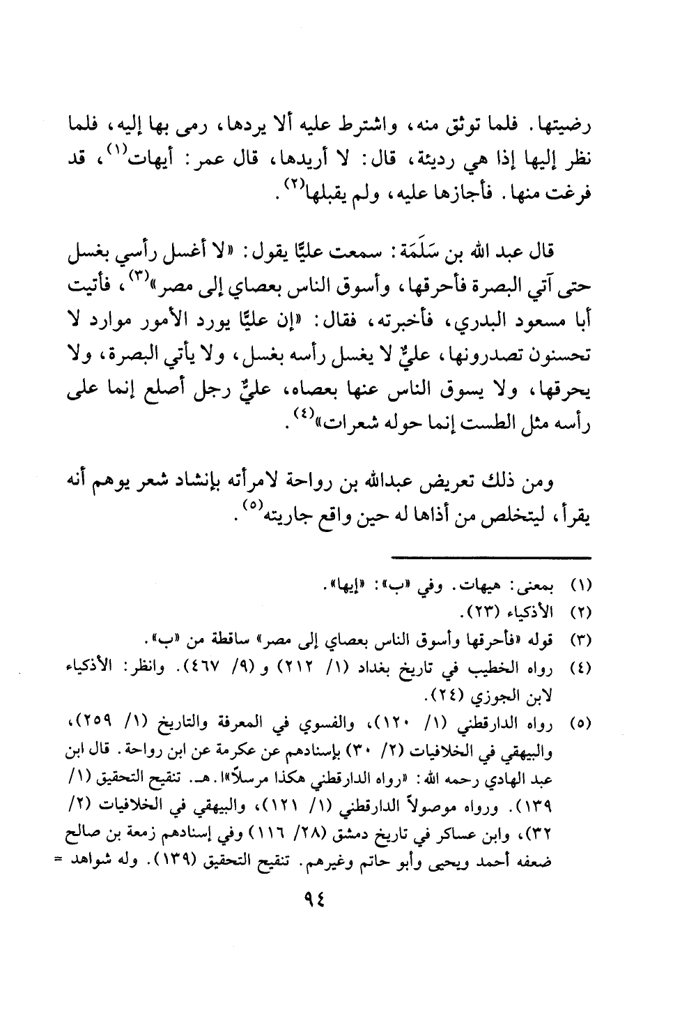 (¬5) رواه الدارقطني (1/ 120)، والفسوي في المعرفة والتاريخ (1/ 259)، والبيهقي في الخلافيات (2/ 30) بإسنادهم عن عكرمة عن ابن رواحة. قال ابن عبد الهادي رحمه الله: "رواه الدارقطني هكذا مرسلًا" ا. هـ. تنقيح التحقيق (1/ 139). ورواه موصولًا الدارقطني (1/ 121)، والبيهقي في الخلافيات (2/ 32)، وابن عساكر في تاريخ دمشق (28/ 116) وفي إسنادهم زمعة بن صالح ضعفه أحمد ويحيى وأبو حاتم وغيرهم. تنقيح التحقيق (139). وله شواهد =