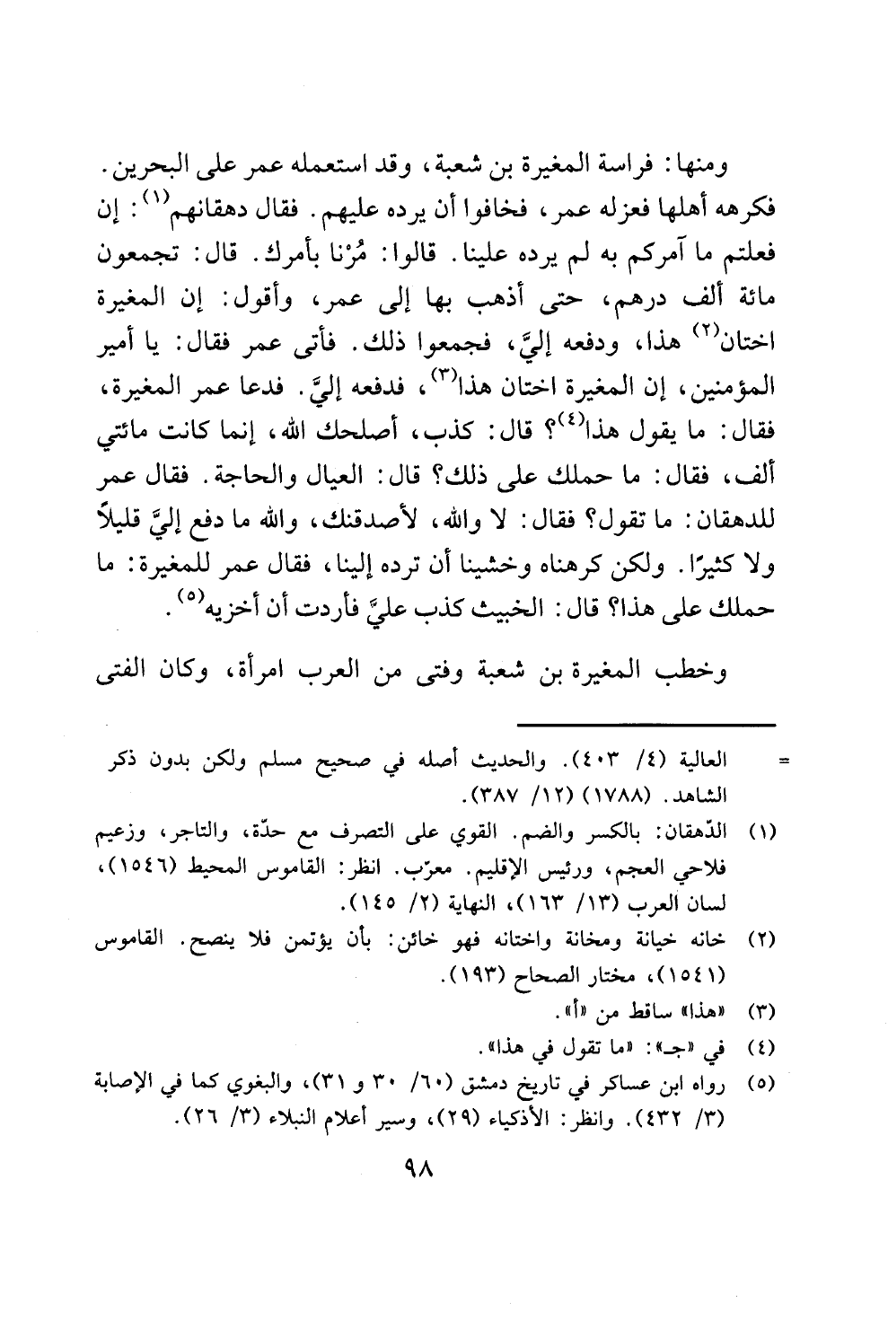 ومنها: فراسة المغيرة بن شعبة، وقد استعمله عمر على البحرين. فكرهه أهلها فعزله عمر، فخافوا أن يرده عليهم. فقال دهقانهم (¬1): إن فعلتم ما آمركم به لم يرده علينا. قالوا: مُرْنا بأمرك. قال: تجمعون مائة ألف درهم، حتى أذهب بها إلى عمر، وأقول: إن المغيرة اختان (¬2) هذا، ودفعه إليَّ، فجمعوا ذلك. فأتى عمر فقال: يا أمير المؤمنين، إن المغيرة اختان هذا (¬3)، فدفعه إليَّ. فدعا عمر المغيرة، فقال: ما يقول هذا (¬4)؟ قال: كذب، أصلحك الله، إنما كانت مائتي ألف، فقال: ما حملك على ذلك؟ قال: العيال والحاجة. فقال عمر للدهقان: ما تقول؟ فقال: لا والله، لأصدقنك، والله ما دفع إليَّ قليلًا ولا كثيرًا. ولكن كرهناه وخشينا أن ترده إلينا، فقال عمر للمغيرة: ما حملك على هذا؟ قال: الخبيث كذب عليَّ فأردت أن أخزيه (¬5).