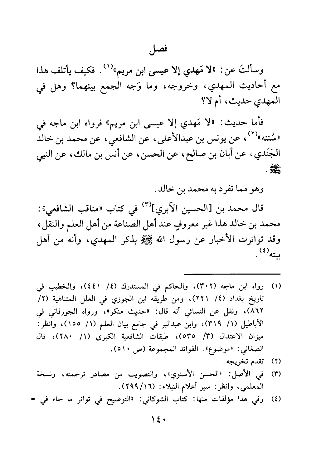 فاما حديث: "لا مهدي إلا عيسى ابن مريم " فرواه ابن ماجه في