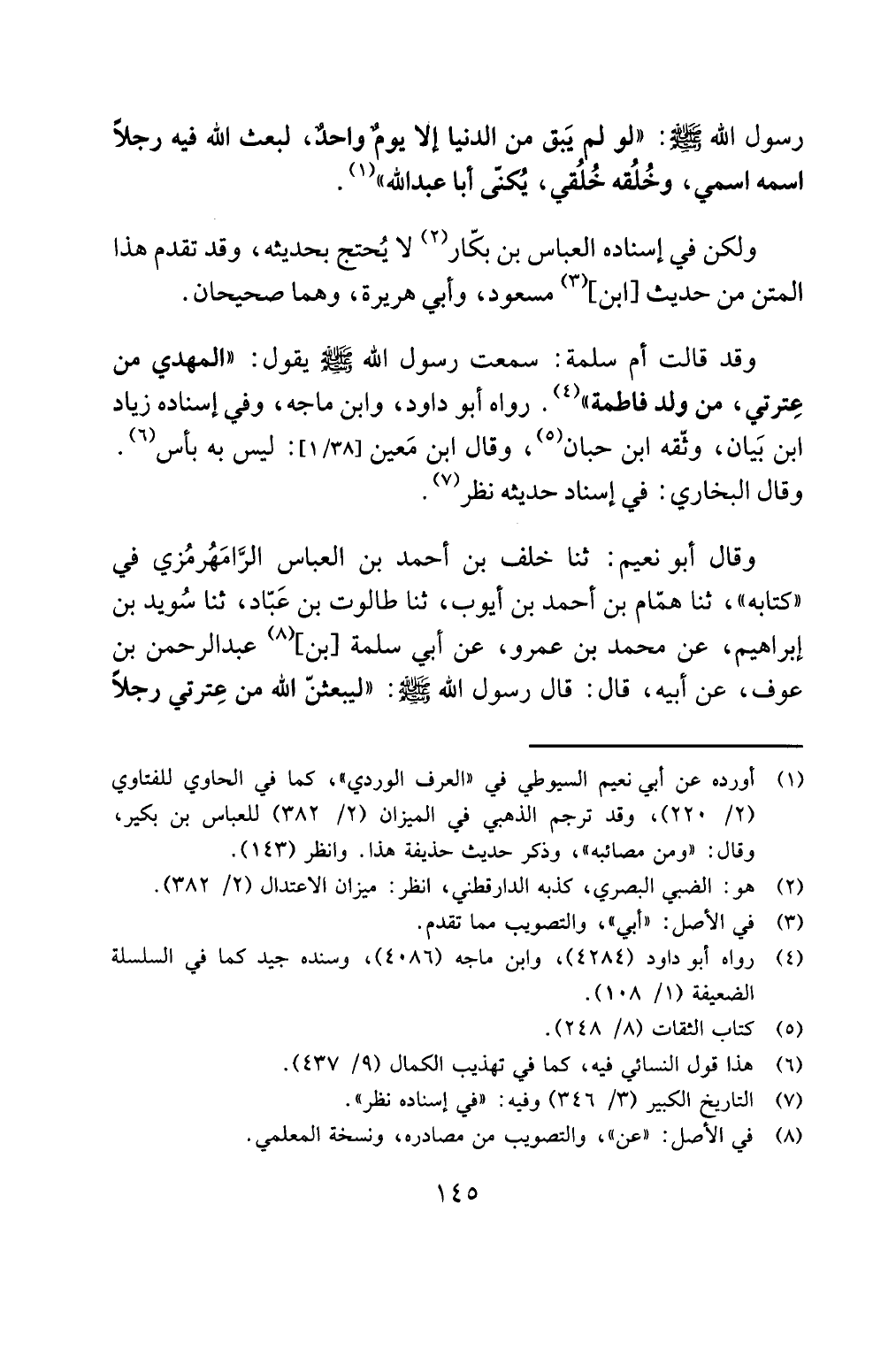وقد قالت أم سلمة: سمعت رسول الله غ! يم يقول: "المهدي من